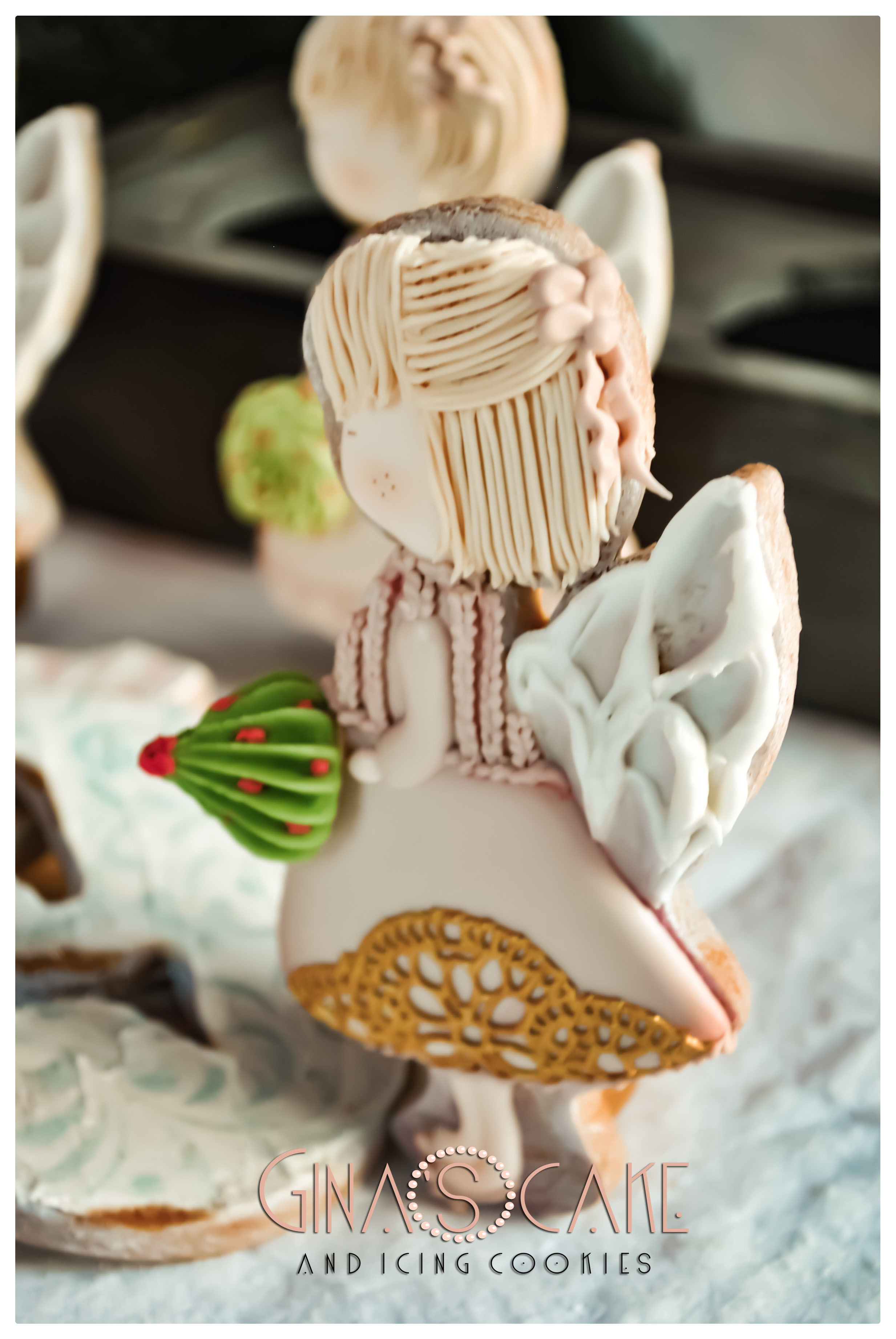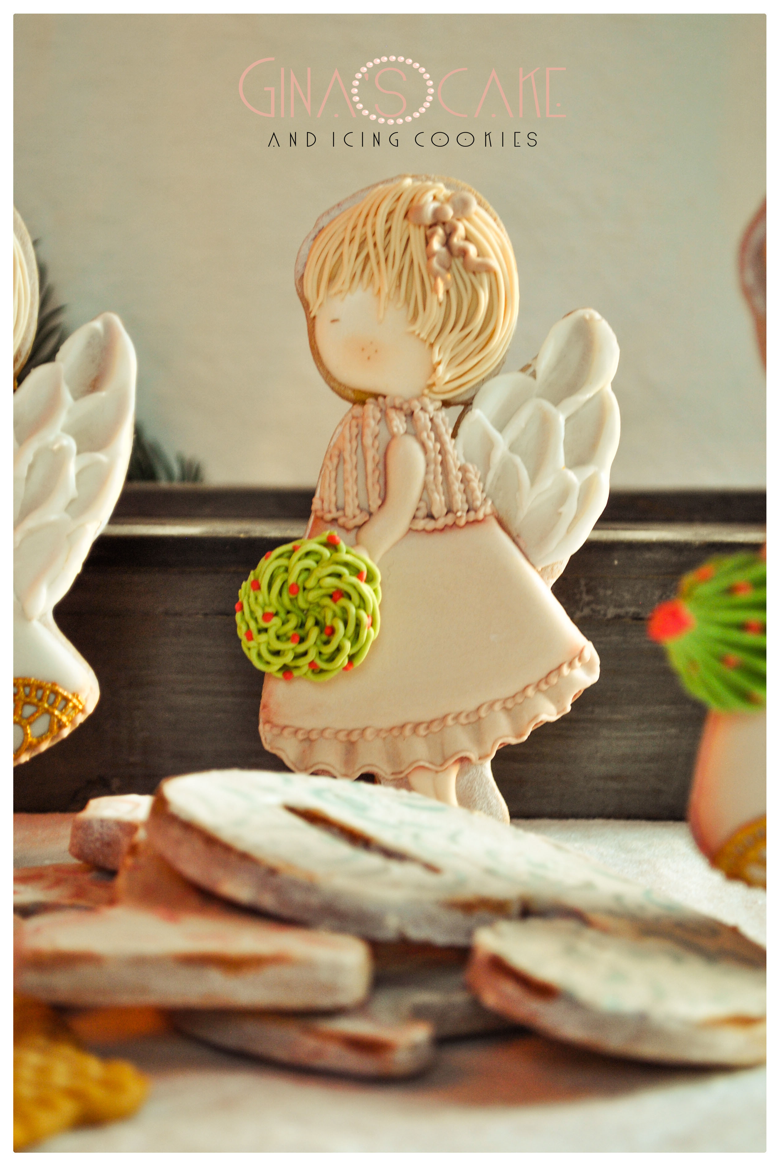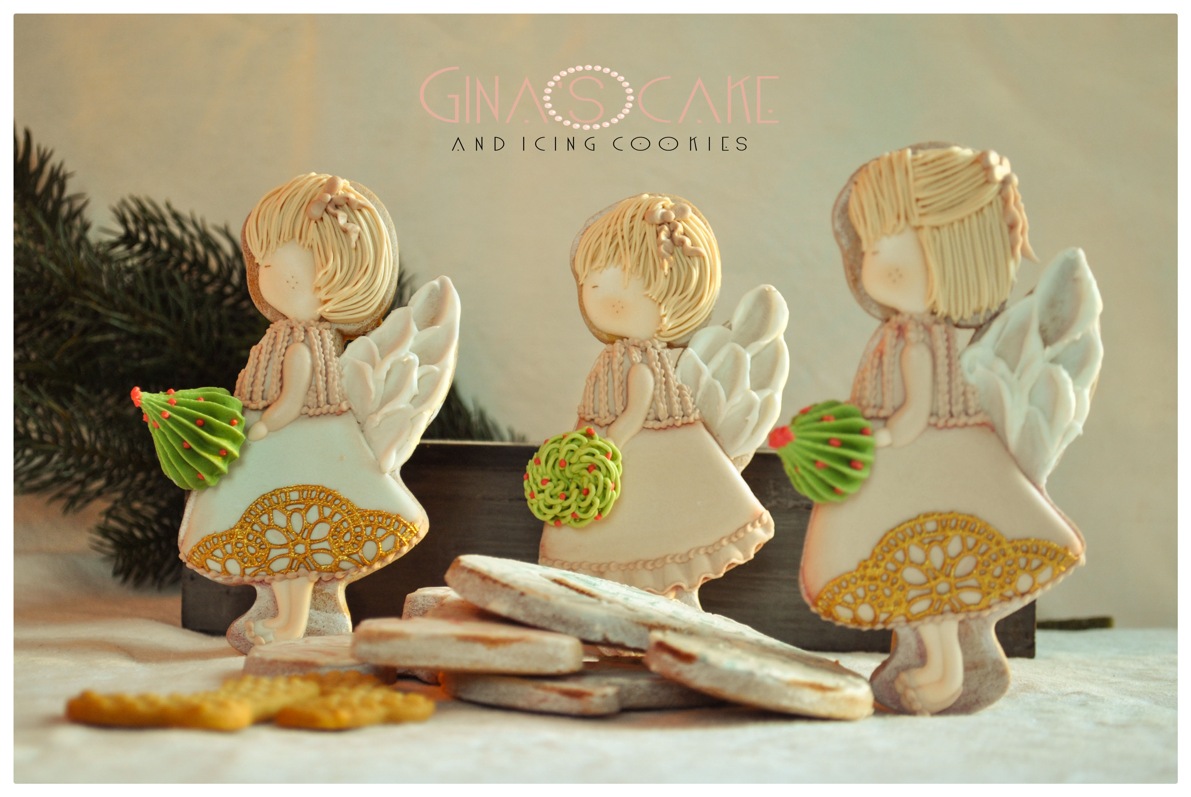 Il tagliabiscotto è di Lubimova Cookie Cutter. Le ali sono state realizzate con la ghiaccia spatolata (consistenza media). Il dettaglio in oro del vestito è in pizzo edibile, realizzato con tappetino SugarVeil e preparato color oro Italian Cake Design di Milano. Per realizzare gli alberelli e la ghirlanda, ho usato ghiaccia dalla consistenza dura con le punte 6B di Wilton e Jem 233.