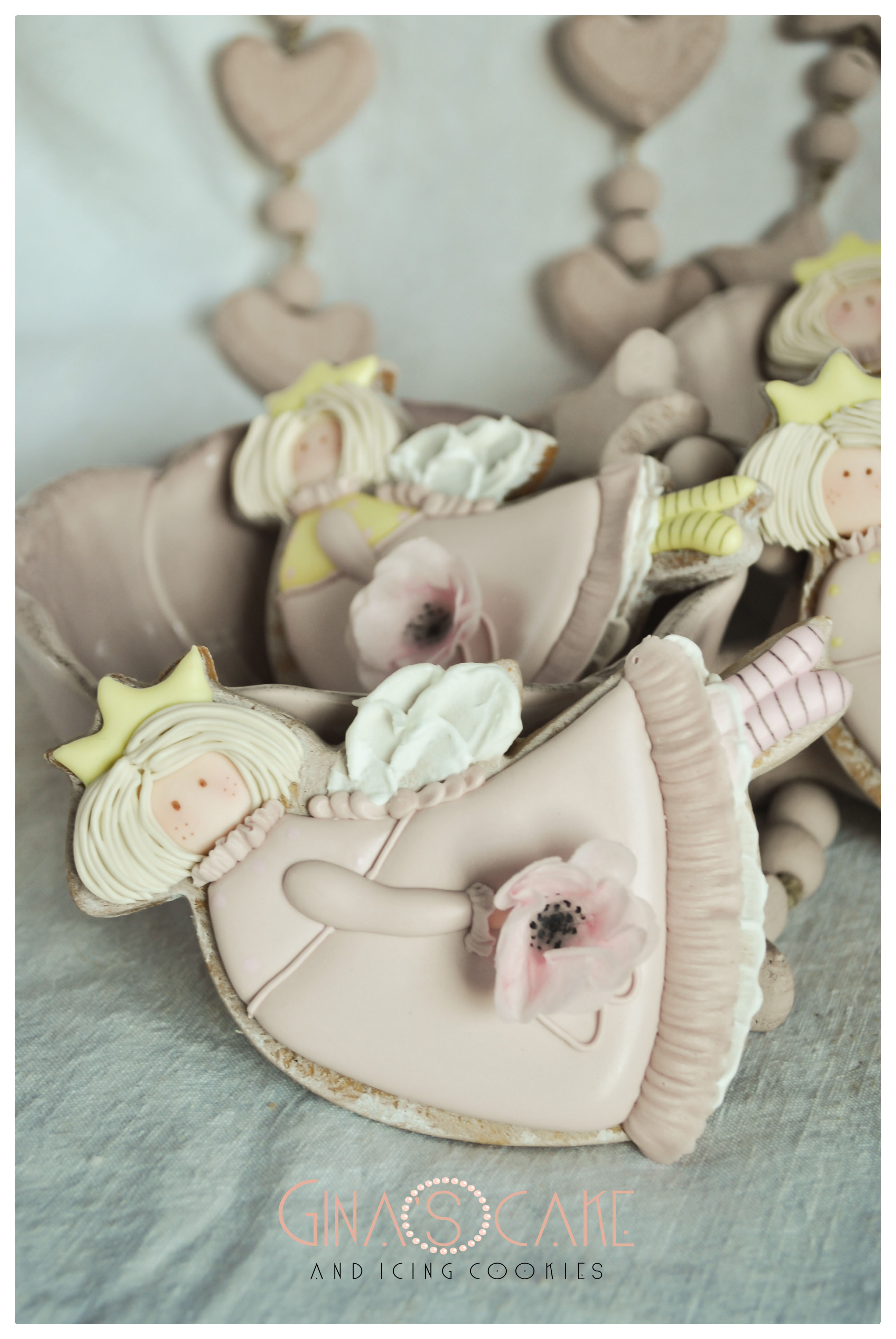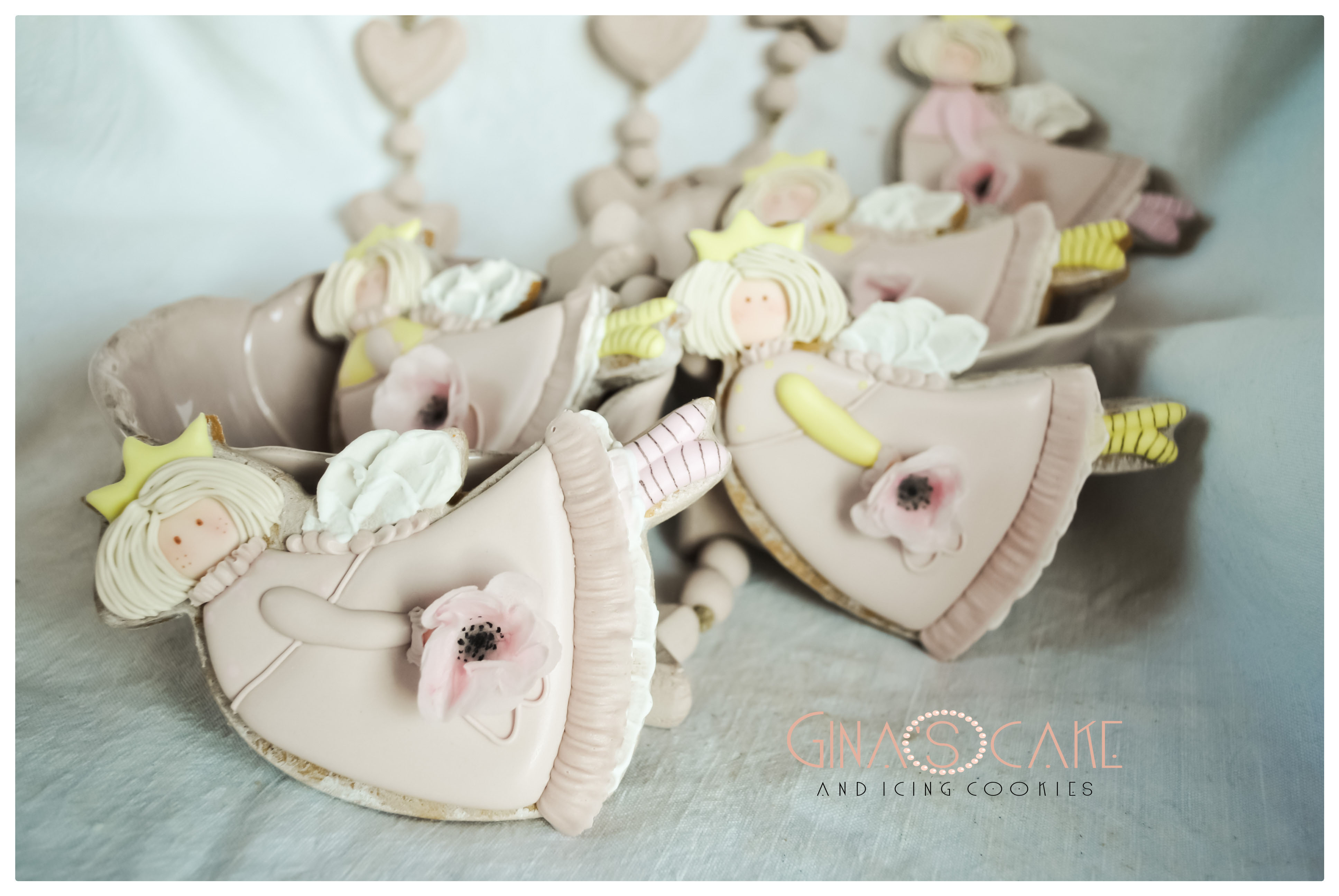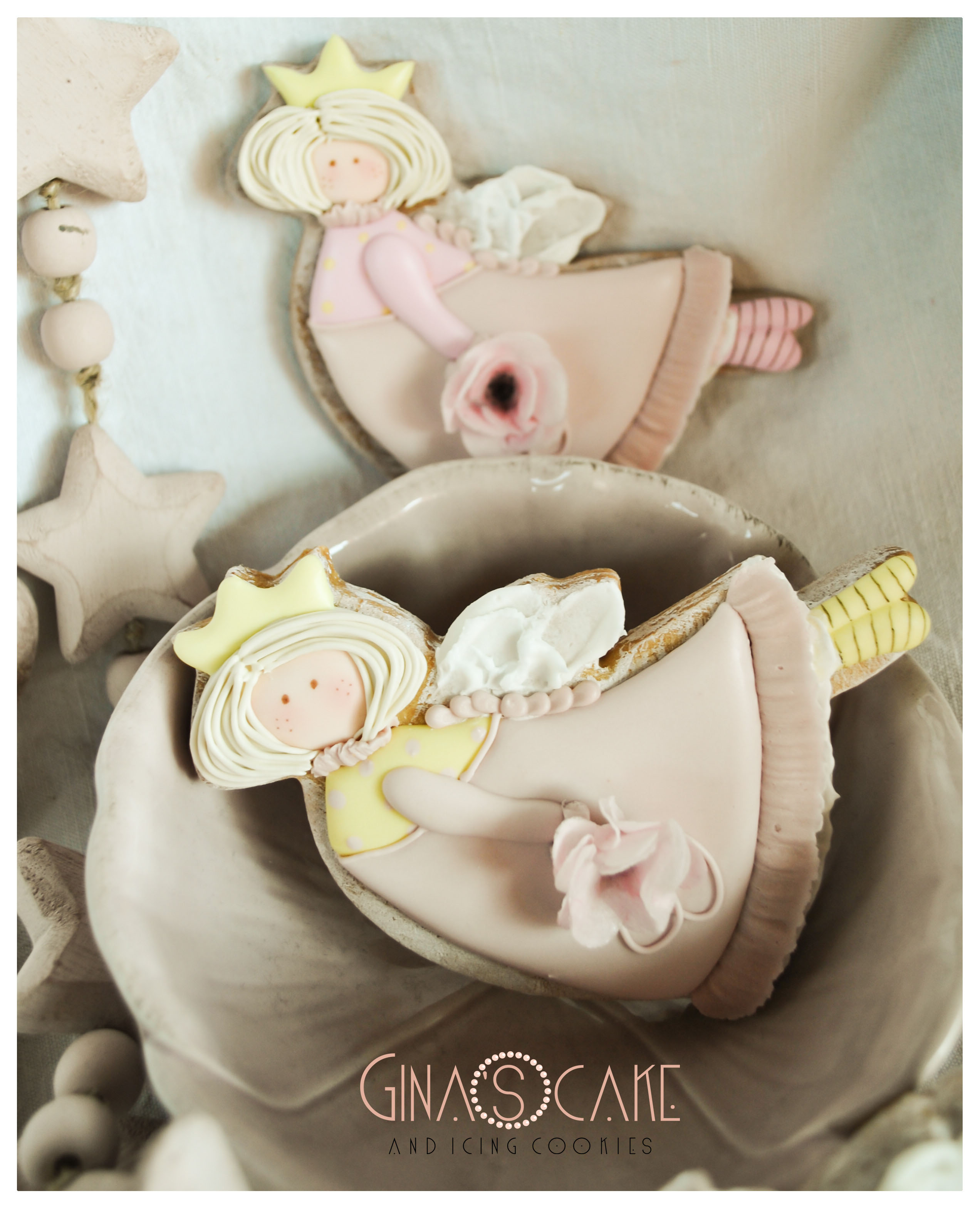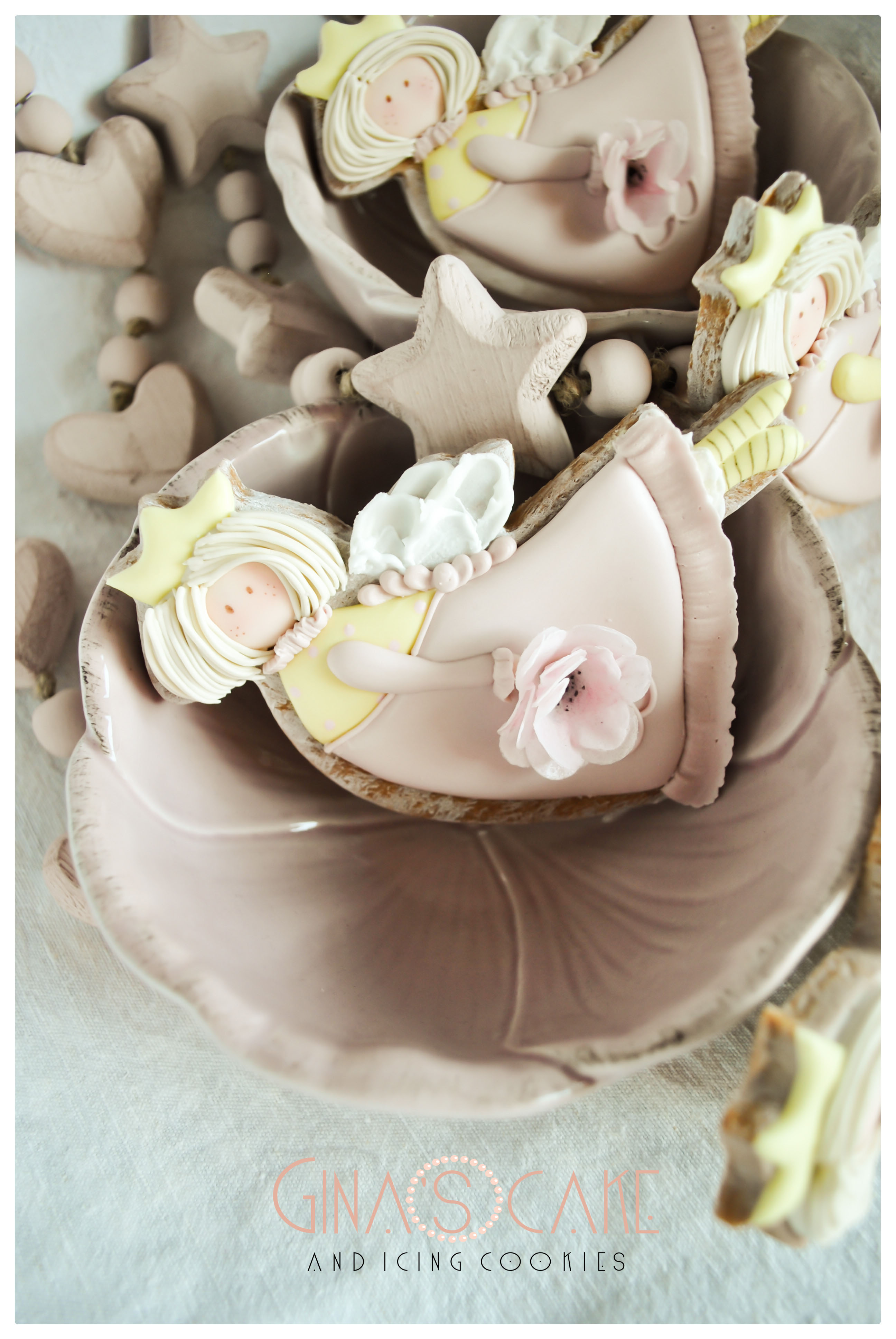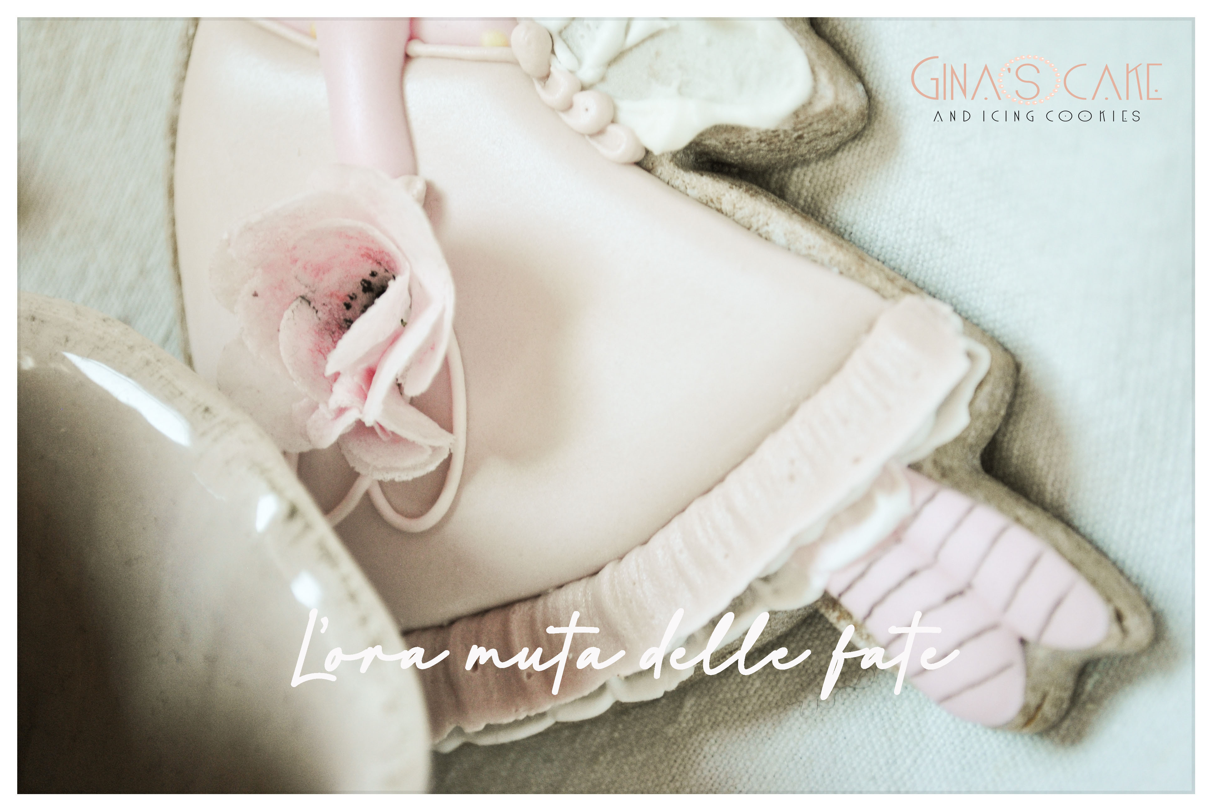 Le fatine sono state realizzate con il tagliabiscotto originale di Make Cookies. Per le ali ho utilizzato l’effetto spatolato. I fiori sono in wafer paper.