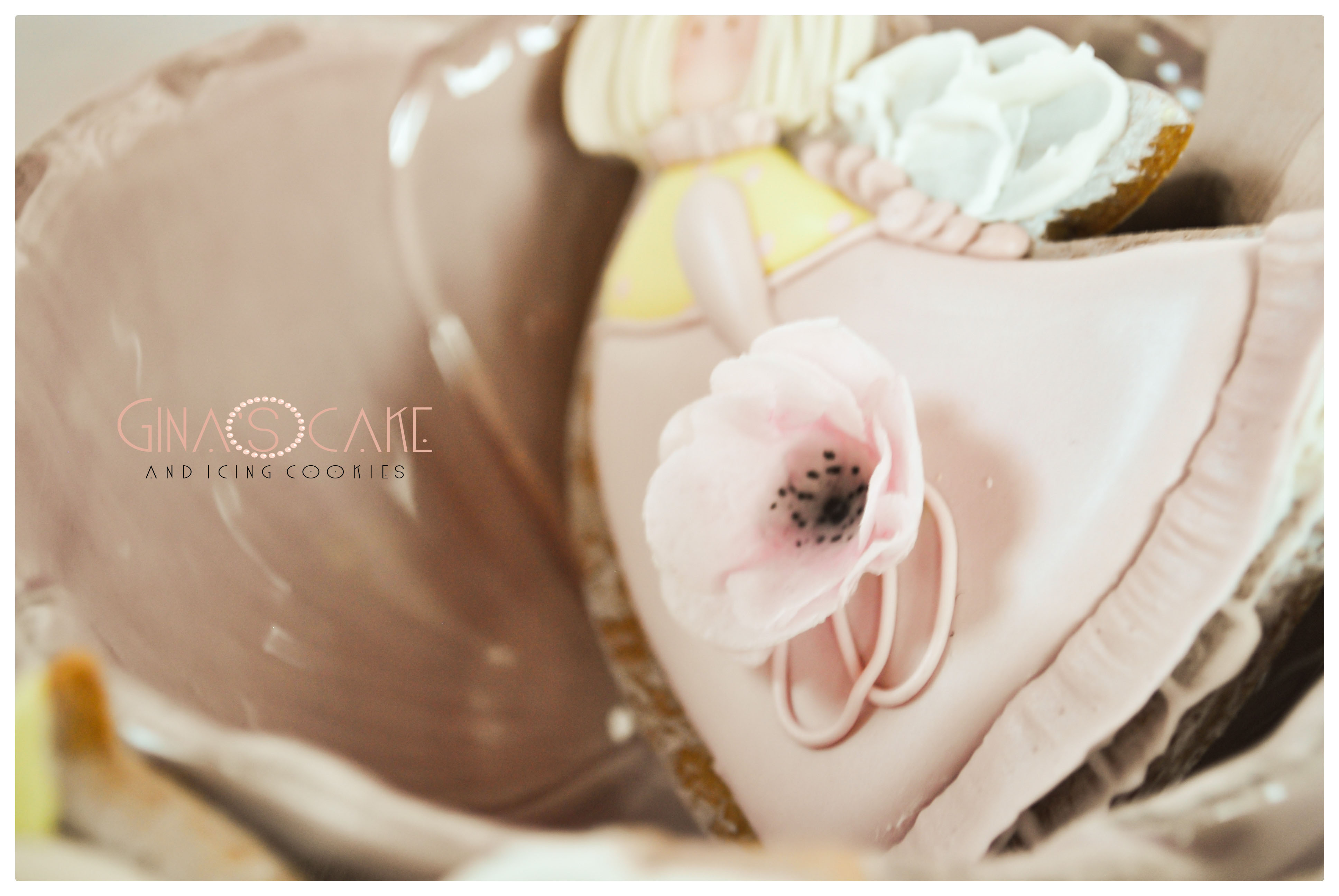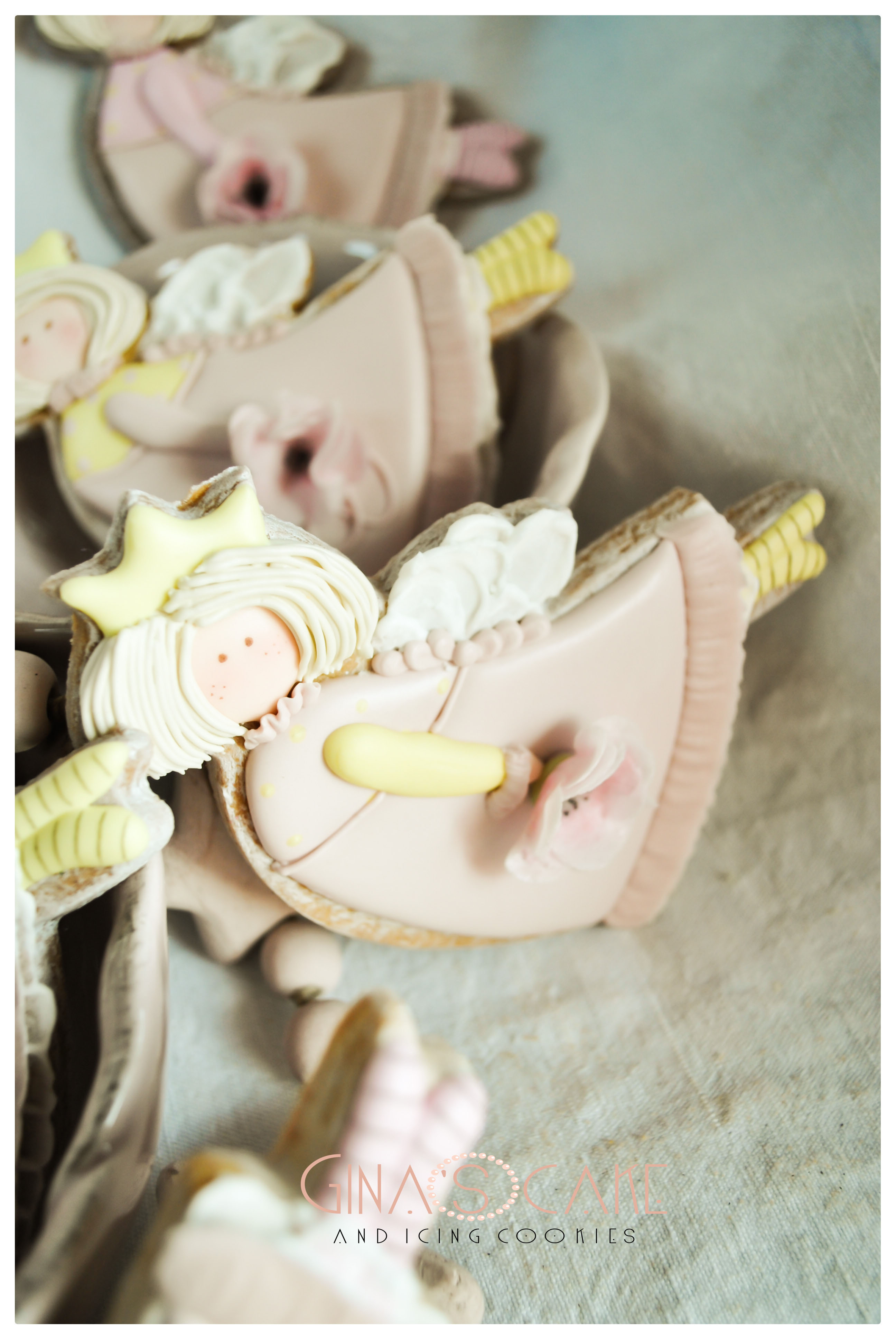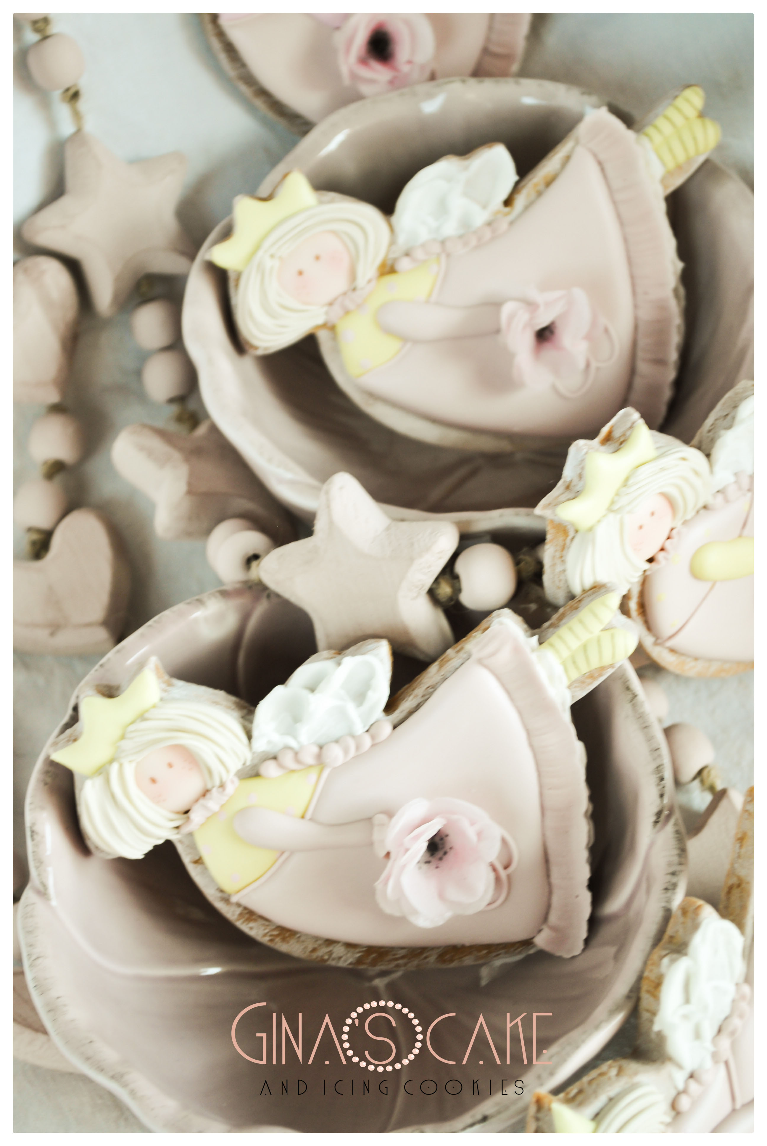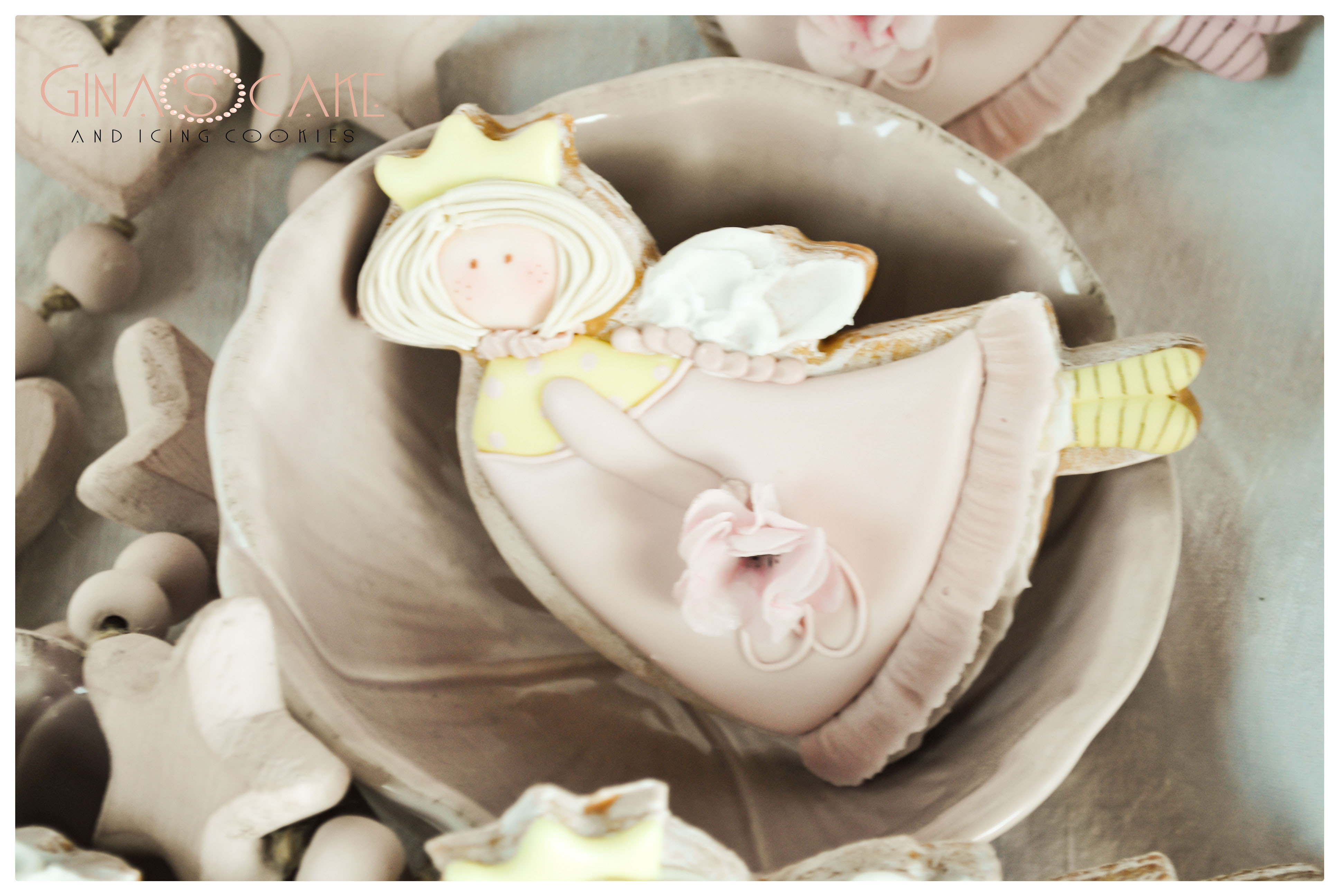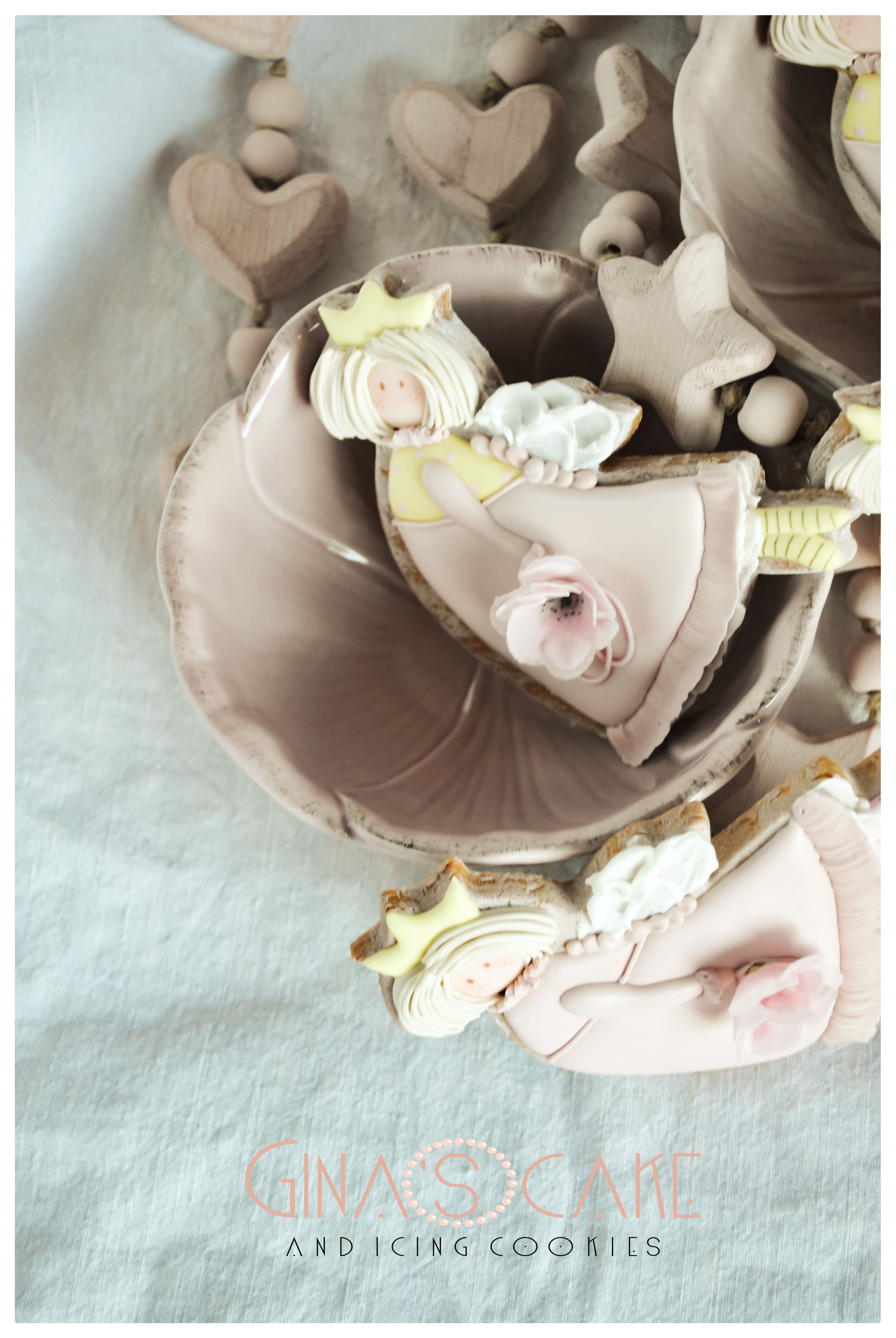 Le fatine sono state realizzate con il tagliabiscotto originale di Make Cookies. Per le ali ho utilizzato l’effetto spatolato. I fiori sono in wafer paper.
