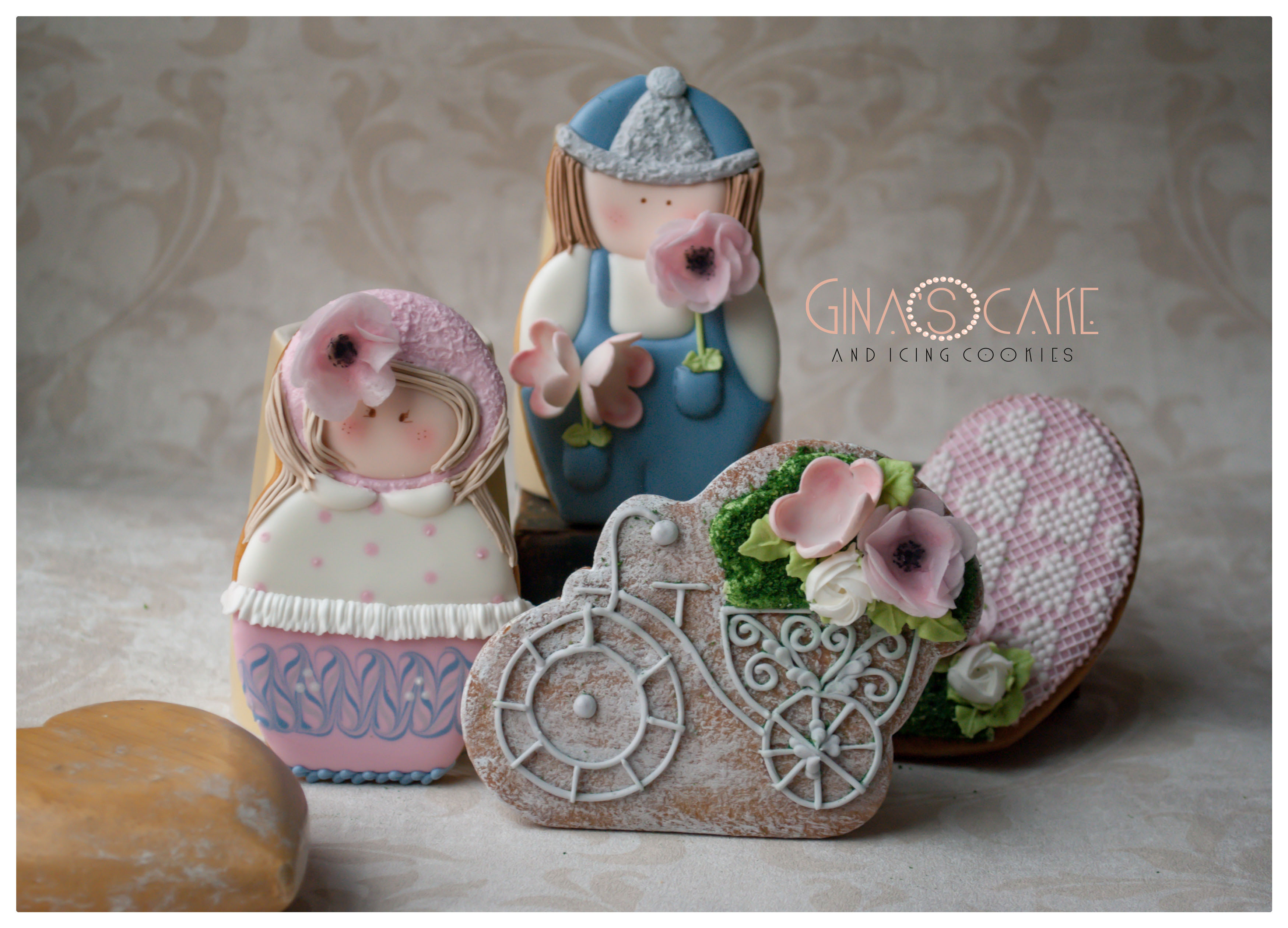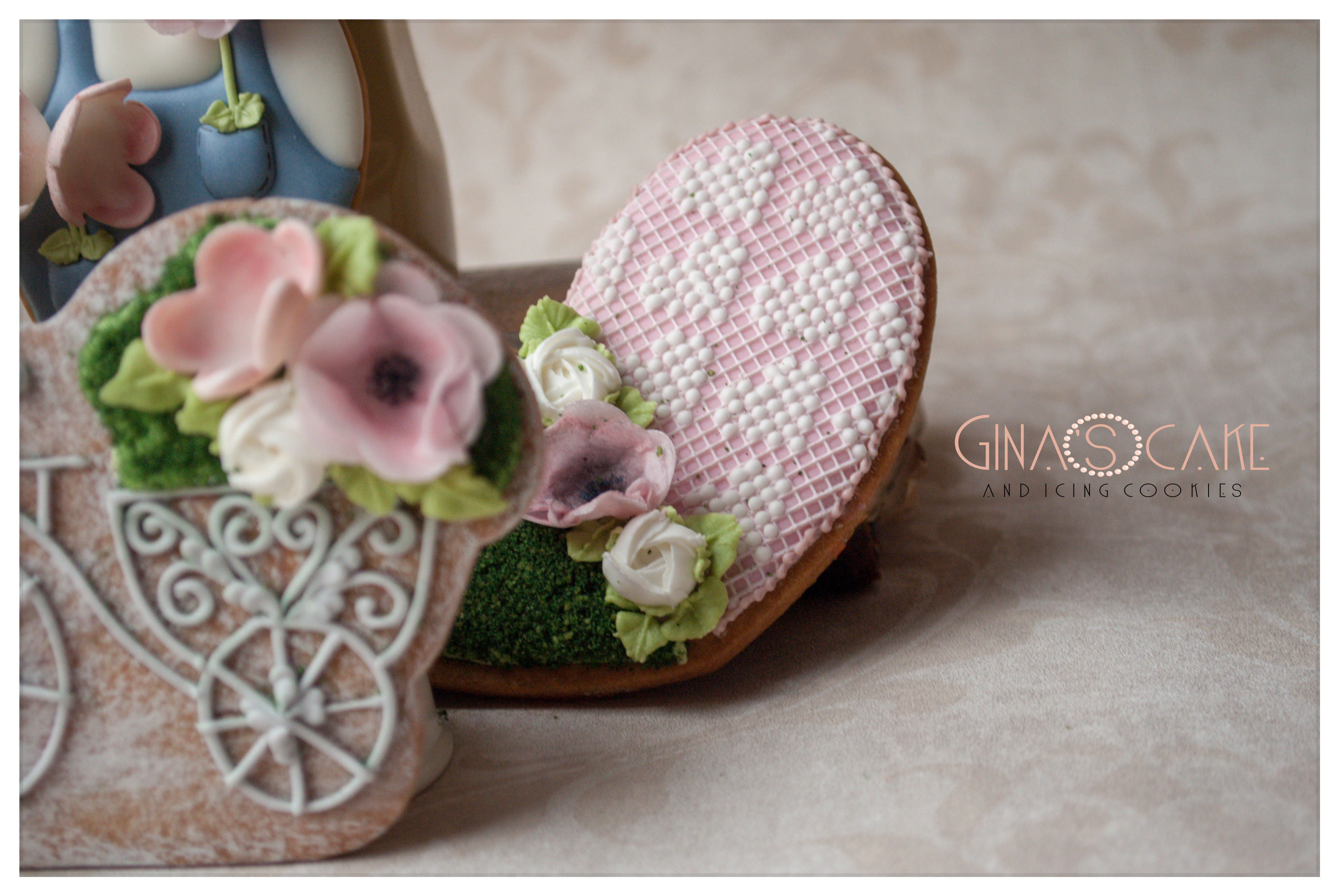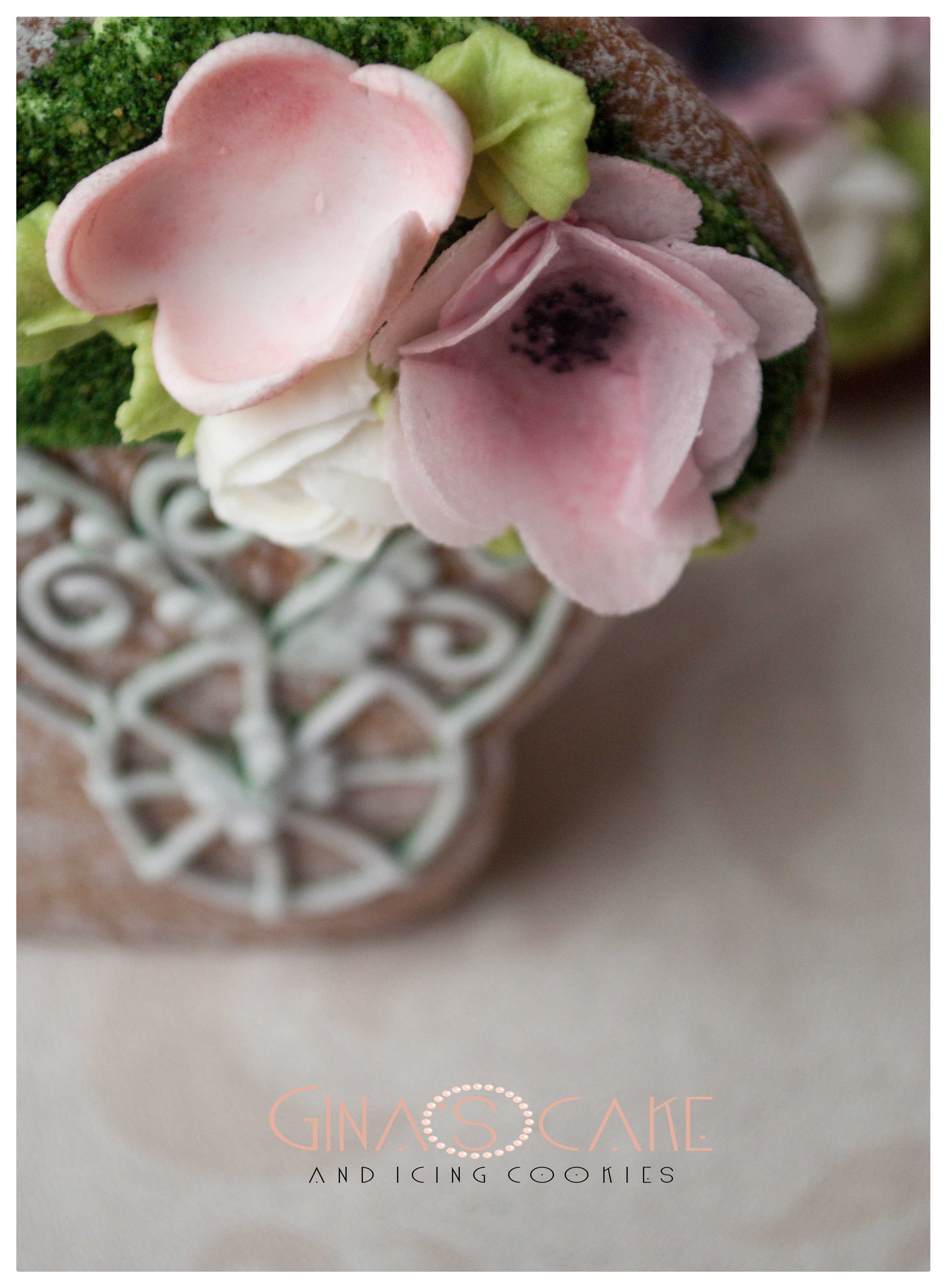 I fiori sono stati realizzati in pasta di zucchero, wafer paper e ovviamente con ghiaccia reale. Sul cuore e sulla bicicletta retrò compare quello che viene definito “effetto muschio” (moss effect). Anche questa, è una tecnica che ho imparato grazie alla generosità di altre cookiers. In rete, trovate vari tutorial e video esplicativi. Personalmente, mi sono ancora una volta affidata al blog di Con Azucar y Algodon, già parecchio tempo fa. Per chi pigramente non avesse voglia di consultare il link di riferimento, ecco una mia breve spiegazione….Innanzitutto vi occorrono dei biscotti al burro (potete usare biscotti confezionati ma anche quelli che eventualmente avevate cotto per decorare e poi, stranamente, vi sono avanzati ….), del colorante verde in gel (scegliete la gradazione che più vi piace), un cucchiaio d’acqua, una busta in plastica per alimenti salva freschezza, tipo Ikea, per intenderci, quindi con la chiusura…..Ridurre i biscotti in briciole abbastanza fini, con l’aiuto di un food processor. Versare il tutto nella busta, aggiungere il colorante diluito nel cucchiaio d’acqua, chiudere bene la busta e…massaggiare i biscotti fin tanto che non si siano colorati uniformemente. Vista la presenza dell’acqua, al fine di eliminare l’umidità, allargare il composto su una teglia ricoperta con carta da forno, e passare in forno a 50°, con modalità ventilata, per circa 30 minuti o comunque per il tempo necessario affinché la polvere risulti nuovamente “secca”. Se riposta in un contenitore a chiusura ermetica, si conserva per 1 mese. Come si applica sulla ghiaccia? Nello stesso identico modo in cui utilizzate i mini confetti decorativi (monpariglia,sprinkle…..) quindi subito dopo aver riempito le parti di biscotto con la ghiaccia reale a consistenza run out (20 sec). Per far aderire bene il muschio su ogni lato inondato, aiutatevi delicatamente con un pennellino asciutto.