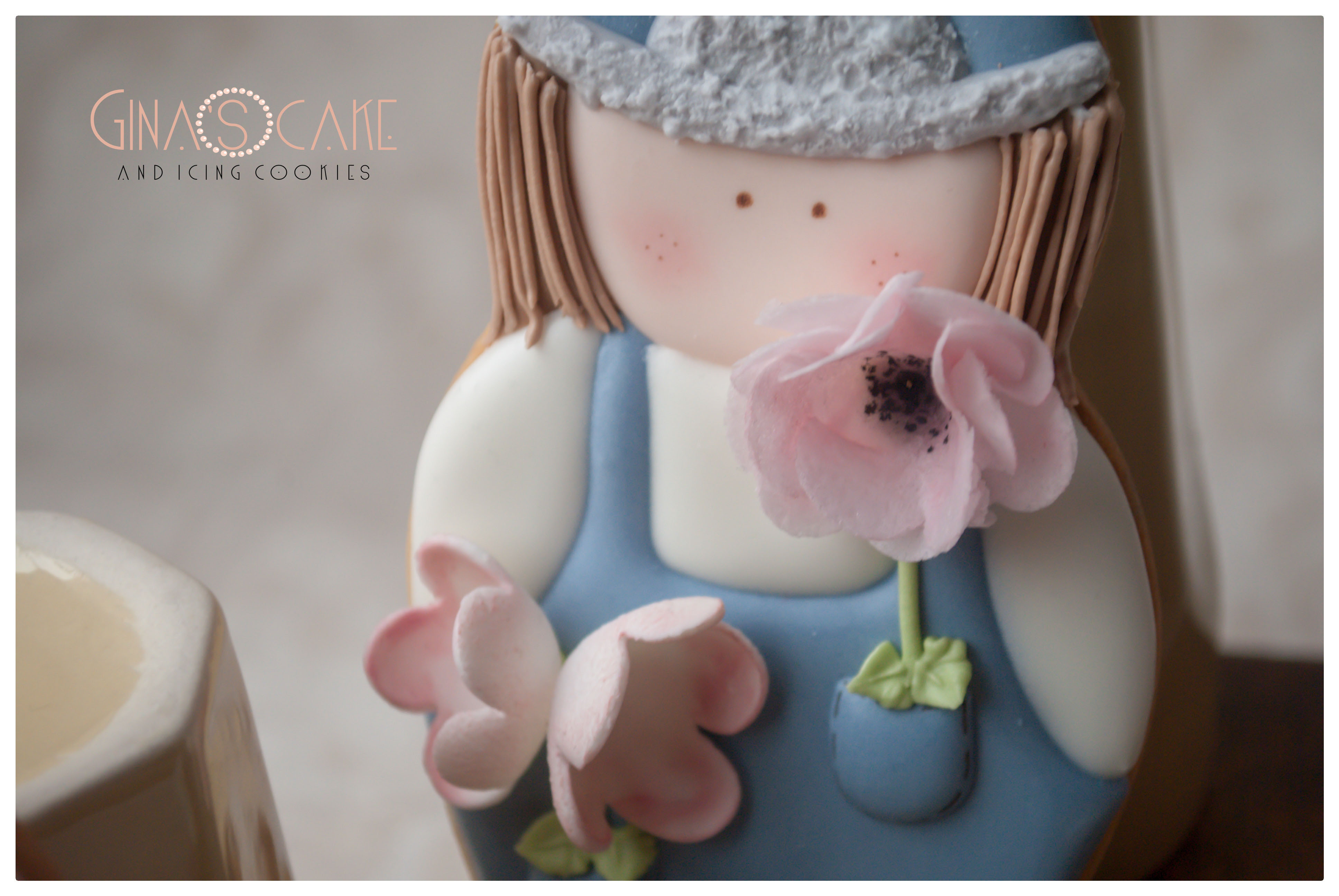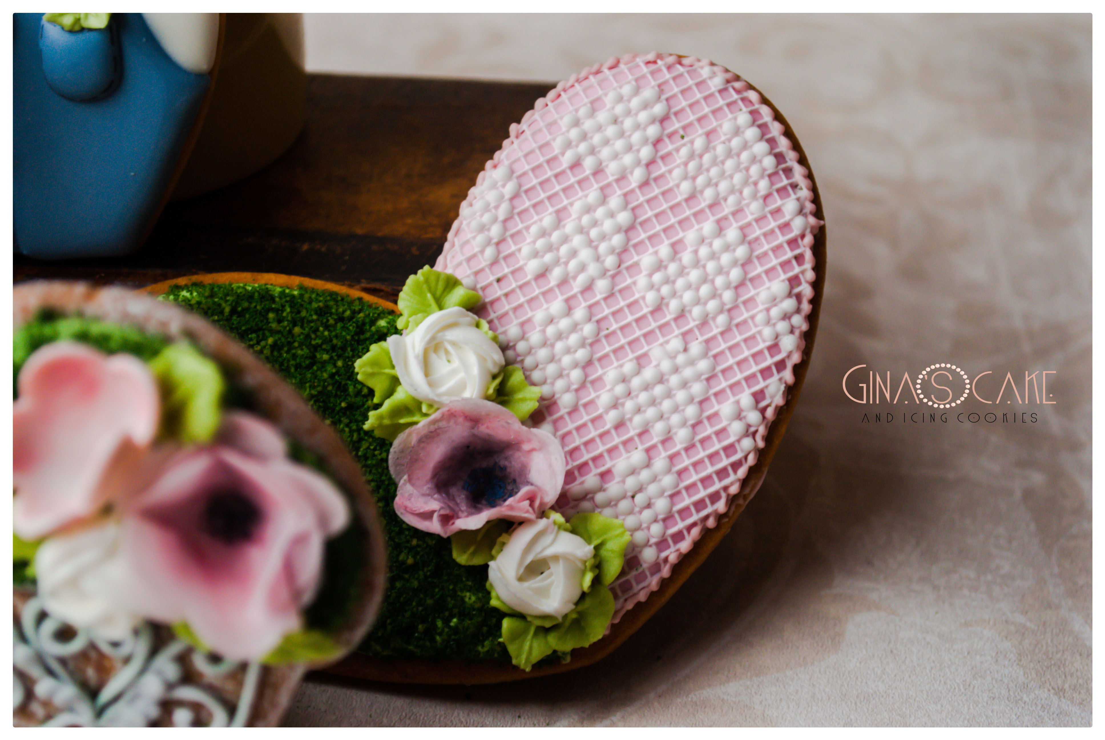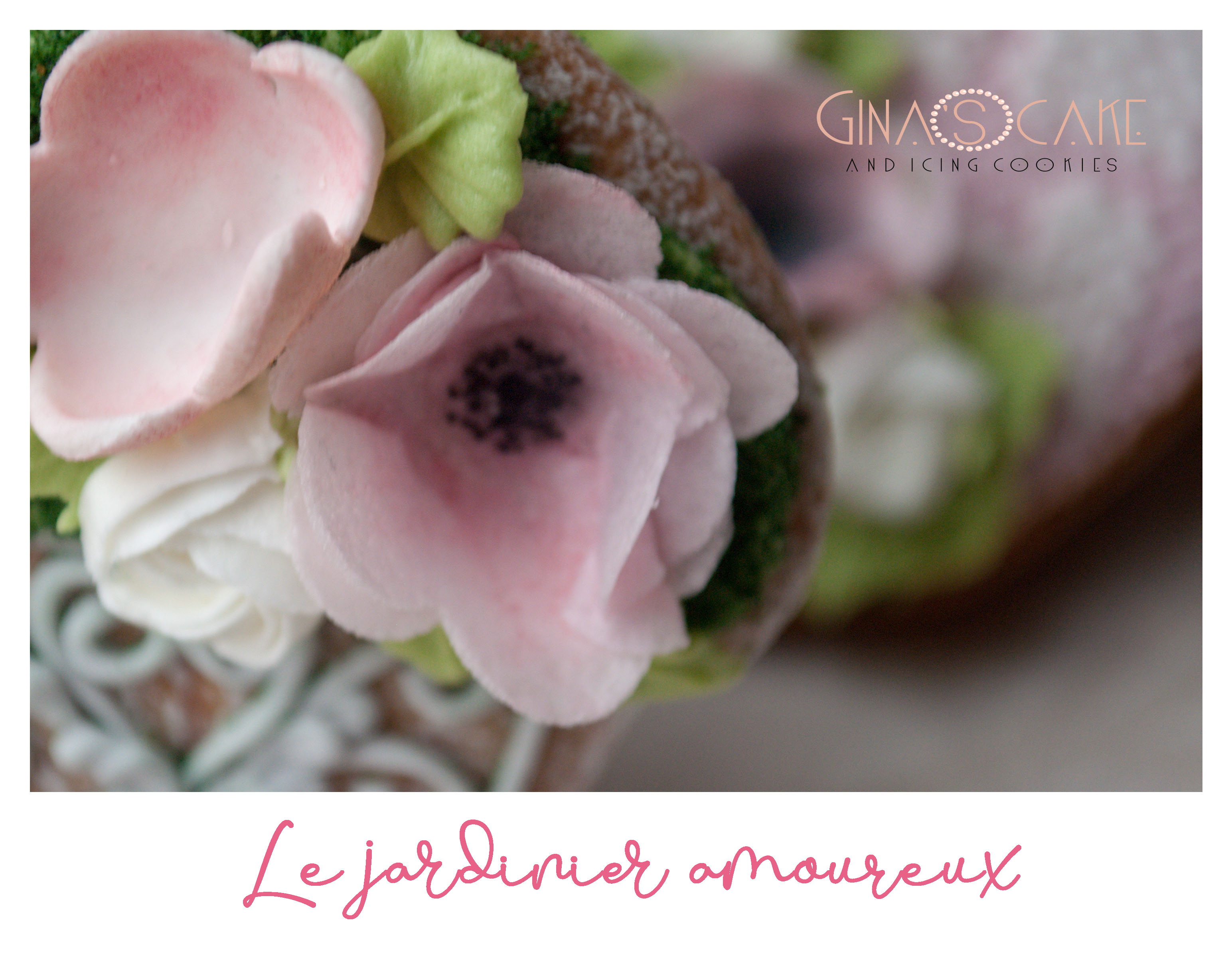 I fiori sono stati realizzati in pasta di zucchero, wafer paper e ovviamente con ghiaccia reale. Sul cuore e sulla bicicletta retrò compare quello che viene definito “effetto muschio” (moss effect). Anche questa, è una tecnica che ho imparato grazie alla generosità di altre cookiers. In rete, trovate vari tutorial e video esplicativi. Personalmente, mi sono ancora una volta affidata al blog di Con Azucar y Algodon, già parecchio tempo fa. Per chi pigramente non avesse voglia di consultare il link di riferimento, ecco una mia breve spiegazione….Innanzitutto vi occorrono dei biscotti al burro (potete usare biscotti confezionati ma anche quelli che eventualmente avevate cotto per decorare e poi, stranamente, vi sono avanzati ….), del colorante verde in gel (scegliete la gradazione che più vi piace), un cucchiaio d’acqua, una busta in plastica per alimenti salva freschezza, tipo Ikea, per intenderci, quindi con la chiusura…..Ridurre i biscotti in briciole abbastanza fini, con l’aiuto di un food processor. Versare il tutto nella busta, aggiungere il colorante diluito nel cucchiaio d’acqua, chiudere bene la busta e…massaggiare i biscotti fin tanto che non si siano colorati uniformemente. Vista la presenza dell’acqua, al fine di eliminare l’umidità, allargare il composto su una teglia ricoperta con carta da forno, e passare in forno a 50°, con modalità ventilata, per circa 30 minuti o comunque per il tempo necessario affinché la polvere risulti nuovamente “secca”. Se riposta in un contenitore a chiusura ermetica, si conserva per 1 mese. Come si applica sulla ghiaccia? Nello stesso identico modo in cui utilizzate i mini confetti decorativi (monpariglia,sprinkle…..) quindi subito dopo aver riempito le parti di biscotto con la ghiaccia reale a consistenza run out (20 sec). Per far aderire bene il muschio su ogni lato inondato, aiutatevi delicatamente con un pennellino asciutto.