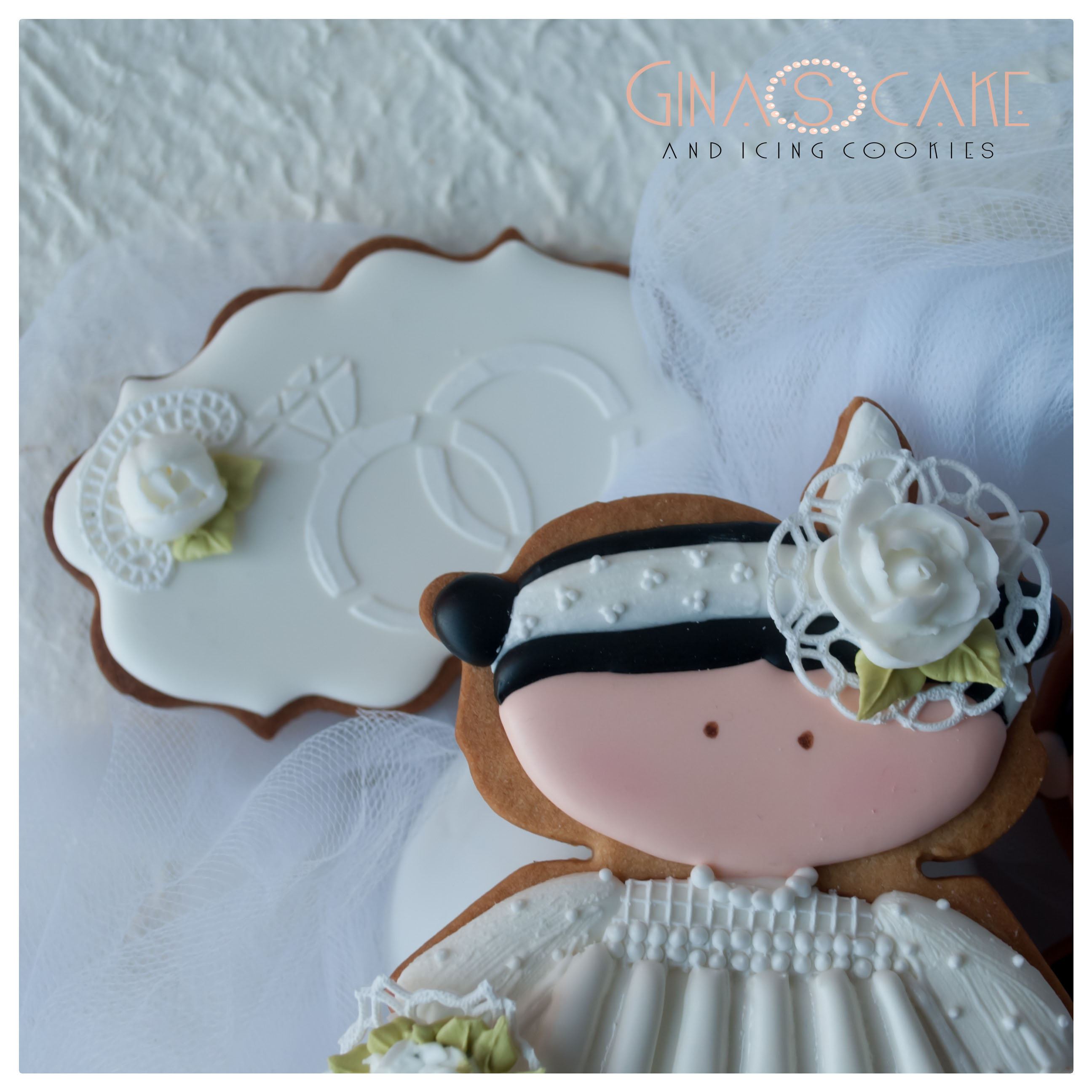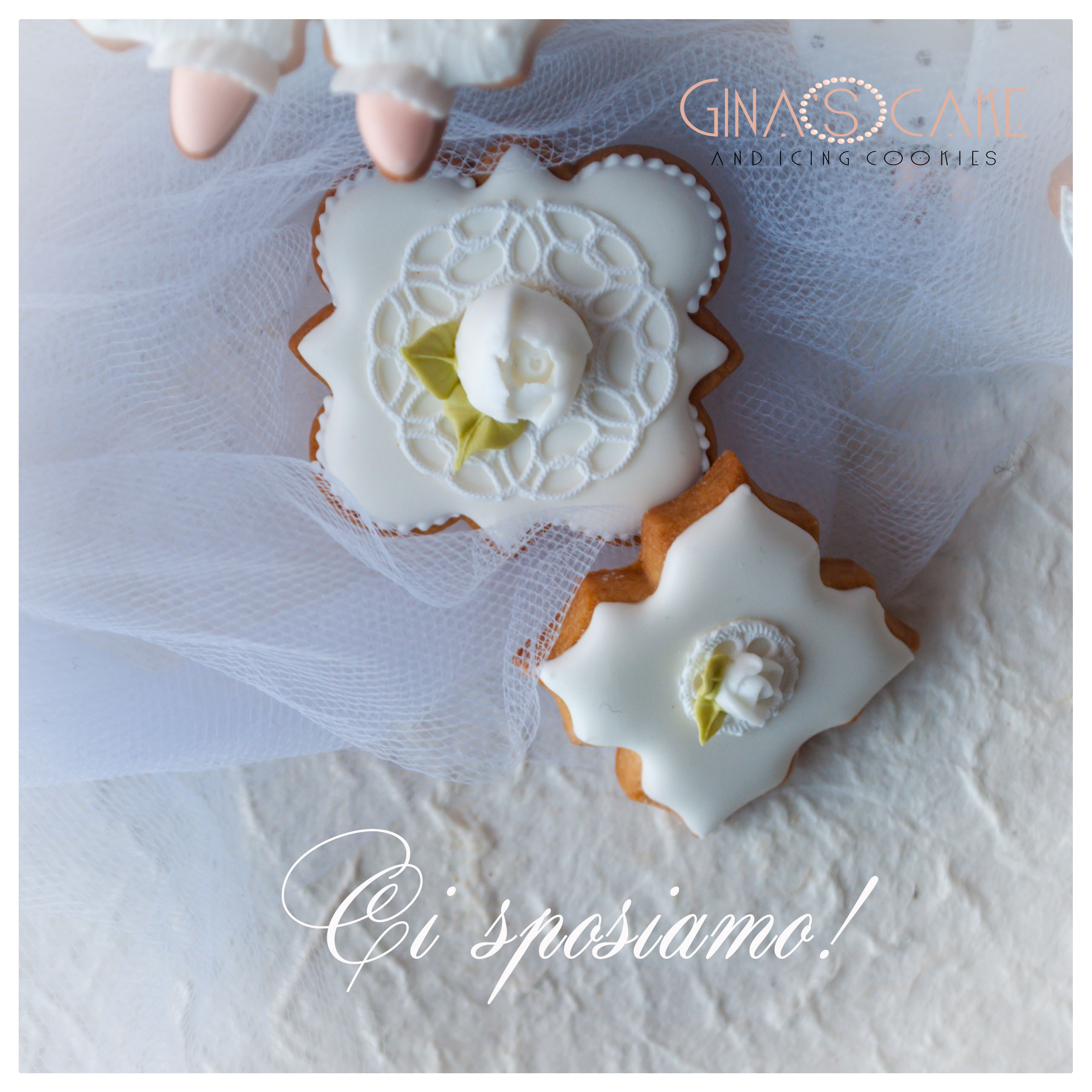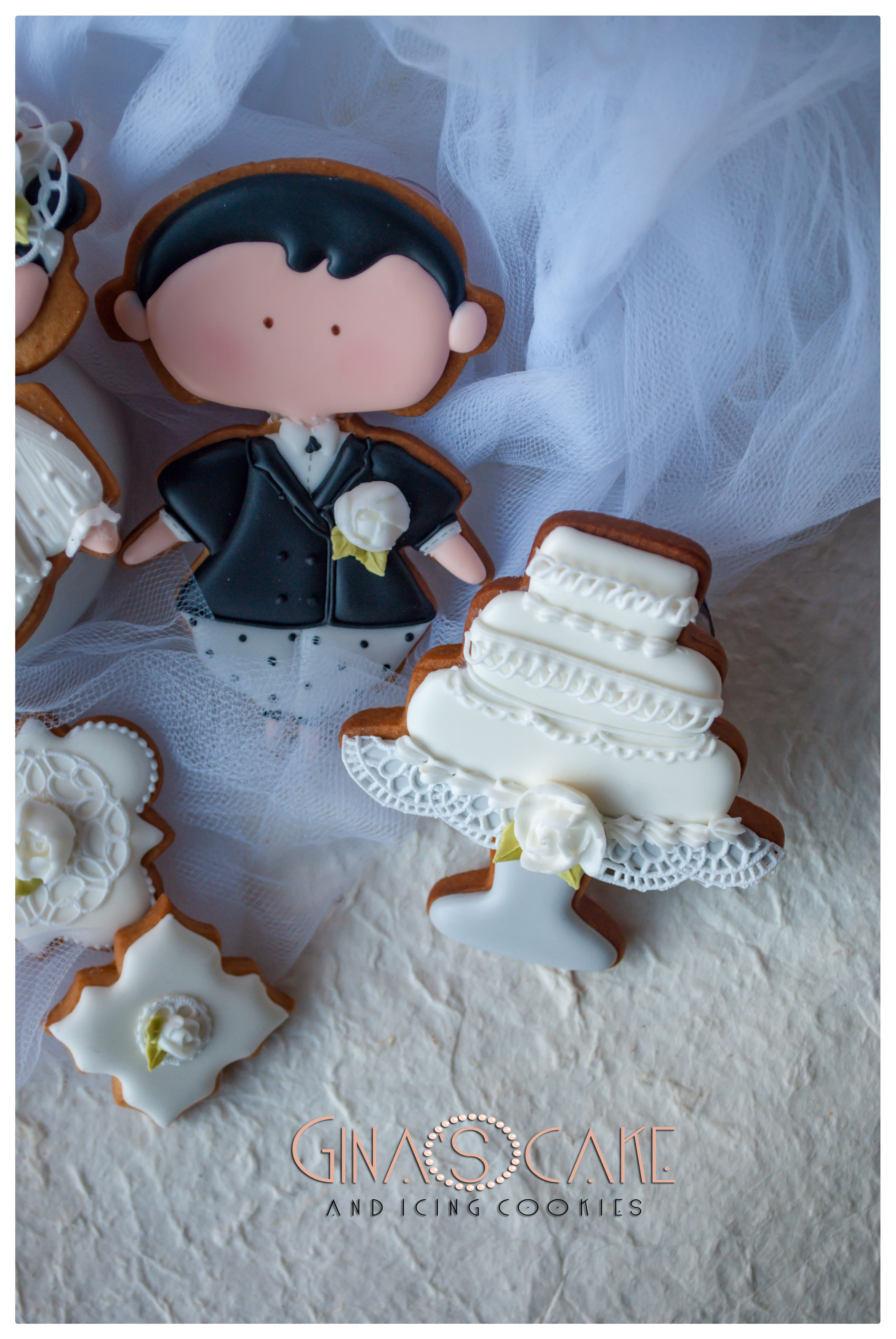 In tutti i biscotti, escluso lo sposo, compaiono dei dettagli realizzati in pizzo edibile, ottenuto con un tappetino Sugarveil e il preparato “Sweet lace” firmato Italian Cake Design di Milano.