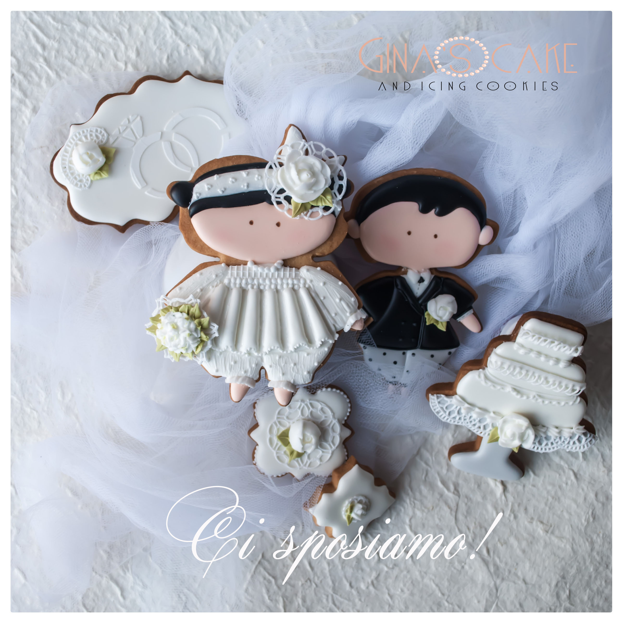 Questo set è stato creando pensando a una delle tante opportunità quale appunto il matrimonio, in cui i biscotti decorati possono degnamente svolgere la funzione di cake topper per una wedding cake, oppure di bomboniera o segnaposto.