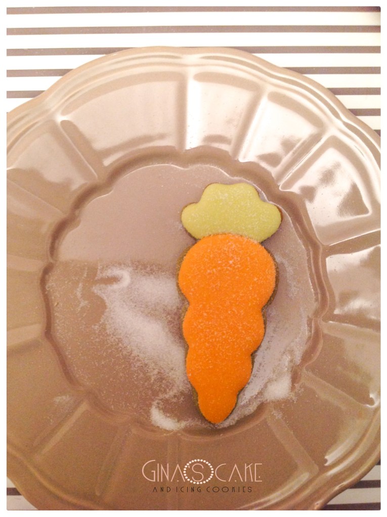 Per realizzarlo, ho preso spunto dal video di Terri Fry, visionato su Instagram. In sostanza, il procedimento è identico a quello utilizzato per l’effetto muschio, solo che anzichè utilizzare dei biscotti in polvere, si utilizza lo zucchero. Come potete vedere dal video, in cui l’autrice presenta lo “sprinkle moss effect”, lo strato di zucchero asciutto viene tamponato con del colorante verde per dare appunto maggior risalto all’effetto muschio. Io invece, ho volutamente omesso questo passaggio, evitando così la colorazione verde e arancione, perchè mi piaceva l’idea di “candire”, “brinare” queste due polpose carote!