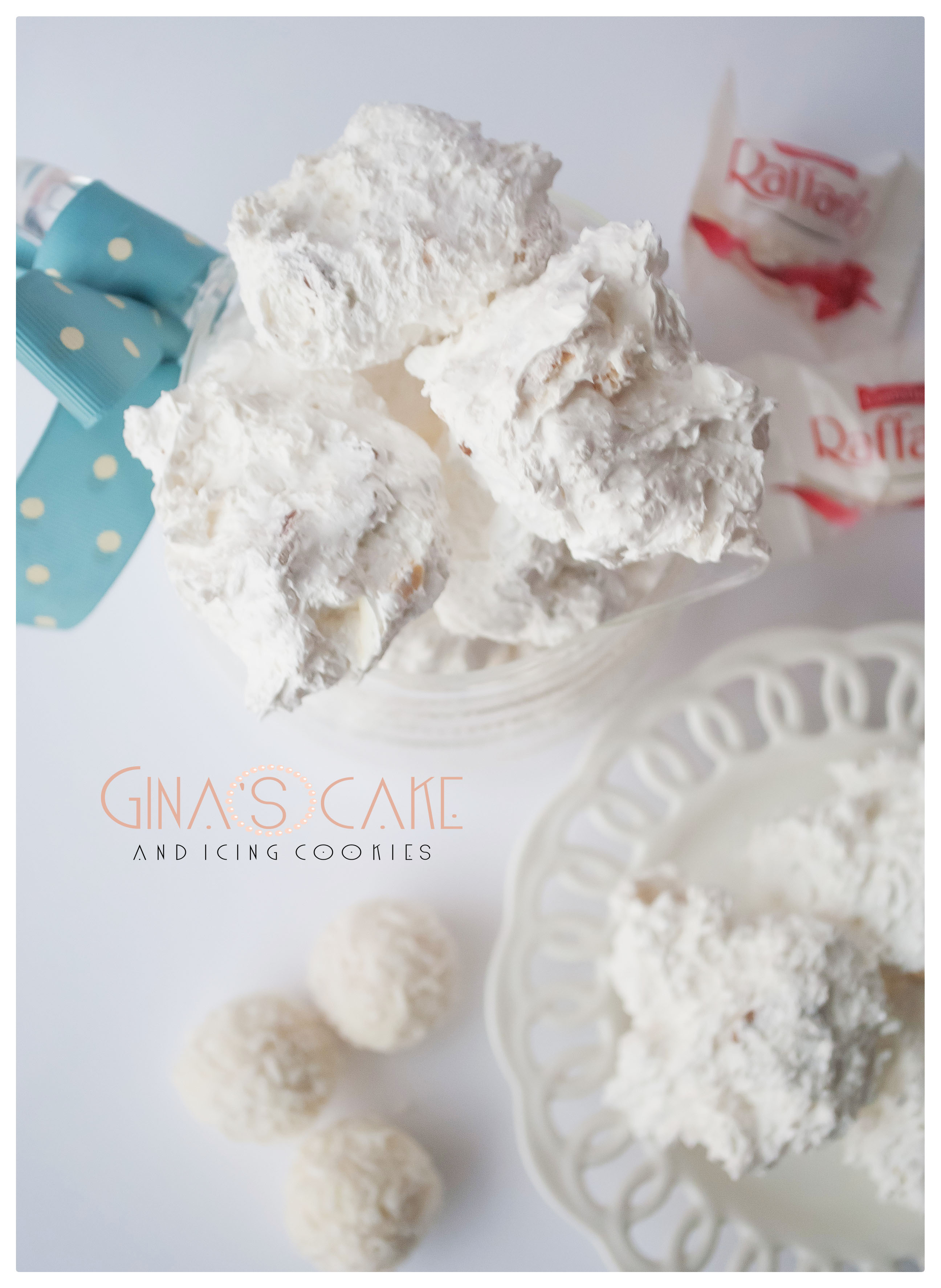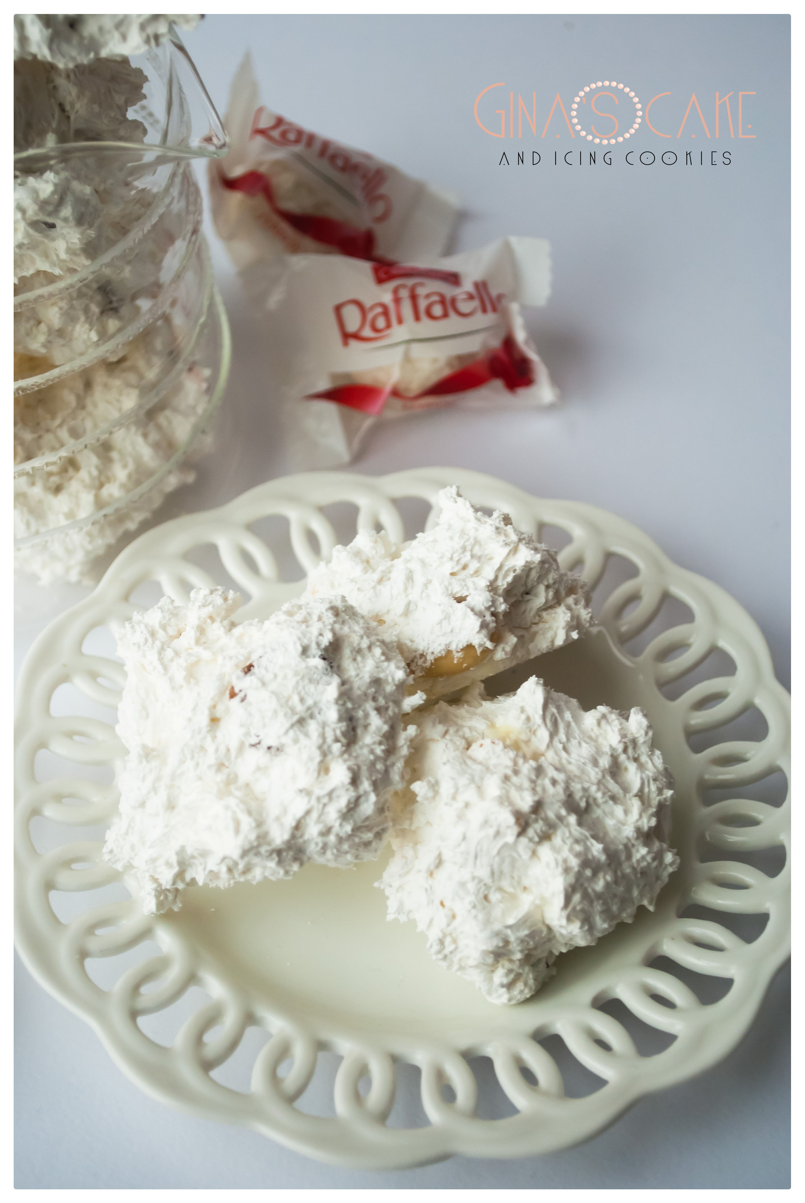 Ingredienti: 7 albumi, 550 gr di zucchero semolato, la polpa di un bacello di vaniglia, 1/2 cucchiaino di cremor tartaro, 75 gr di noci, 75 gr di cocco in polvere, 100 gr di Raffaello Ferrero