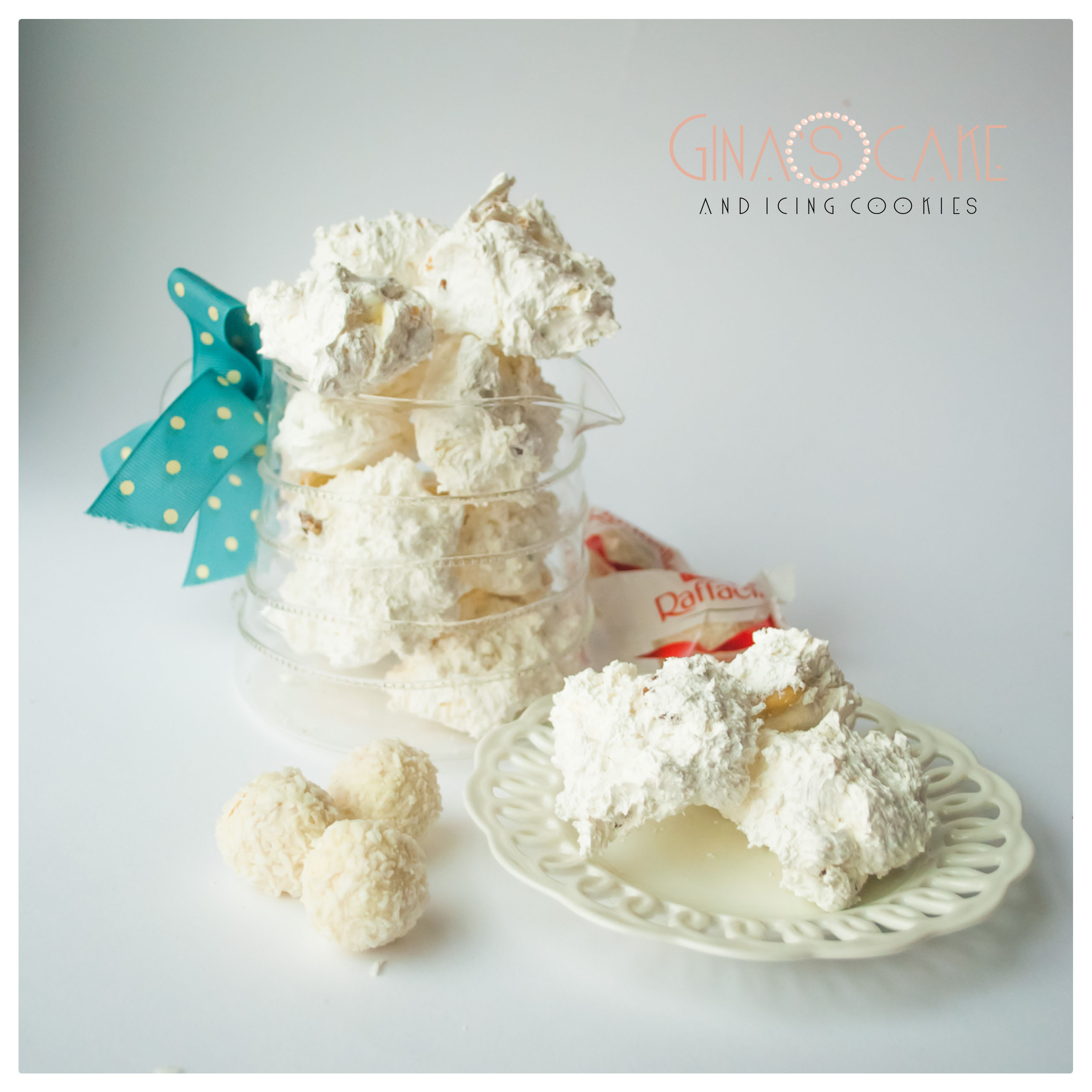 Procedimento: pre-riscaldare il forno a 125°. Preparare il bagnomaria. In una ciotola resistente al calore, inserire gli albumi, il cremor tartaro e la vaniglia. Inserire la ciotola sul bagnomaria bollente. Mescolare con una frusta a mano gli ingredienti fin tanto che lo zucchero non si sia completamente sciolto (ci vorranno 10 minuti circa). Versare il composto nella planetaria e montare con la frusta a filo per almeno 5 minuti, ad alta velocità. Quando la massa sarà lucida e soda (bec d’oiseau), incorporare bene, con una spatola gli altri ingredienti: noci, cocco e i Raffaello spezzati in due. Dressare le meringhe su una/due teglie di carta da forno con l’aiuto di un cucchiaio per gelato. Cuocere per un’ora con la ventola in funzione. Una volta terminata la cottura, lasciare le meringhe ancora per mezz’ora nel forno spento. Lasciatele raffreddare completamente fuori dal forno e poi….divertitevi!