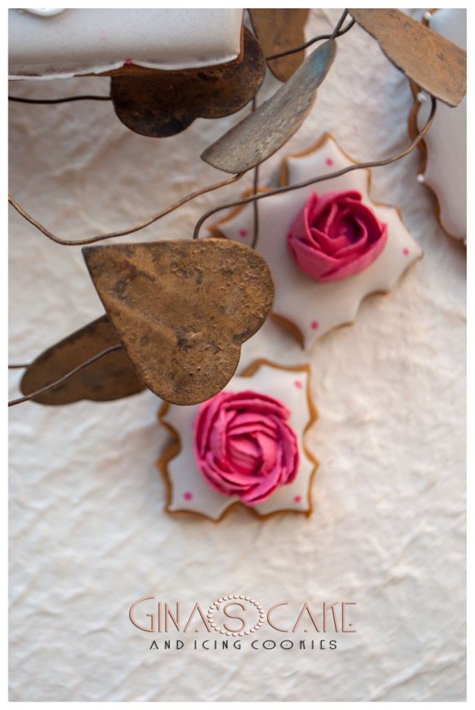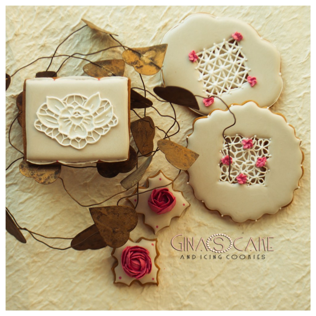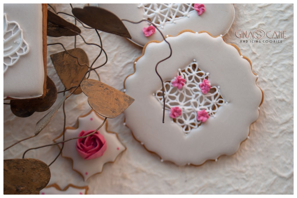 E poi ci sono quei biscotti che non nascono per un evento particolare o per una storia da raccontare ma semplicemente per il piacere di provare tecniche mai affrontate. In questo caso, per i due biscotti tondeggianti mi sono ispirata alla decoratrice giapponese Bon Farine. Il taglio centrale del biscotto è stato ricoperto con un pizzo in ghiaccia realizzato a mano, ovvero con bocchetta e sac poche. Dopo averlo realizzato a parte su un foglio di acetato, una volta ben asciutto é stato trasferito sul biscotto e fissato con una minuscola quantità di ghiaccia. Successivamente, ho realizzato il riempimento del contorno, con la consueta consistenza run out. In questo modo, il pizzo si è “inglobato” creando un unico livello: in pratica si ottiene un vero e proprio intarsio…..(chissà se sono riuscita a spiegarmi….). Non esistono in rete tutorial della cookier in questione, per cui anche in questo caso (vi ricordate dell’effetto trasparente di Rainbow Chima? -per gli smemorati, cliccare qui), per il metodo ho fatto di testa mia anche se devo dire, se si conosco appena due o tre nozioni sulla decorazione dei biscotti con ghiaccia, non è difficile dedurre come comportarsi.