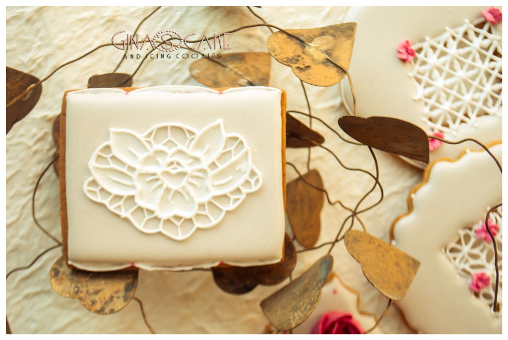 Per questo biscotto, realizzato con la tecnica del Cutwork Embroidery (ispirata a quella del ricamo vero e proprio), ci sono svariate decoratrici da cui prendere spunto, io ho scelto Victoria Olovyannaya conosciuta come Pryaniki_Kozuli. Su un riempimento ben asciutto , ho ricalcato il disegno con l’ago dello scribe tool. Con la ghiaccia dalla consistenza media/morbida ho realizzato i vari contorni. I riempimenti sono stati realizzati con la tecnica dell’Embroidery anglais (ghiaccia diluita con acqua e applicata con un pennellino).