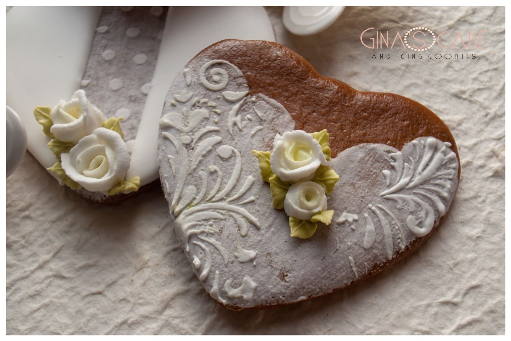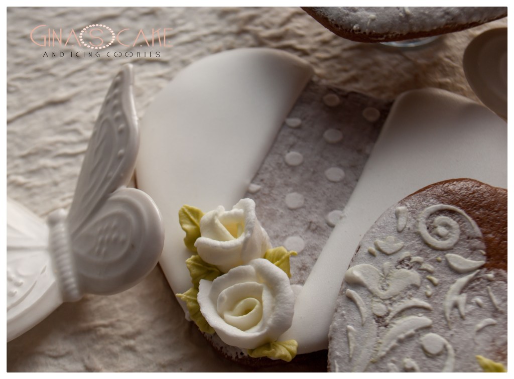 L’effetto organza è realizzato con due diverse consistenze di ghiaccia reale del medesimo colore (ton sur ton): ad una base molto fluida ma asciutta si abbina la consistenza media con l’uso di uno stencil. Dopo aver diluito la ghiaccia (consistenza run out) con poca acqua alla volta , la si applica con un pennello direttamente sulla frolla. Si lascia asciugare e poi si procede con lo stencil. In merito alla quantità di acqua necessaria non posso darvi delle indicazioni precise perchè dipende dalla quantità della ghiaccia che andrete a diluire. Certamente non dovrete esagerare: regolatevi a occhio cioè in base ai vostri gusti perchè con una presenza eccessiva di acqua (superiore alla quantità di ghiaccia) otterrete un’effetto più trasparente ma anche più lucido, ovvero un risultato che a me personalmente, non piace tanto.