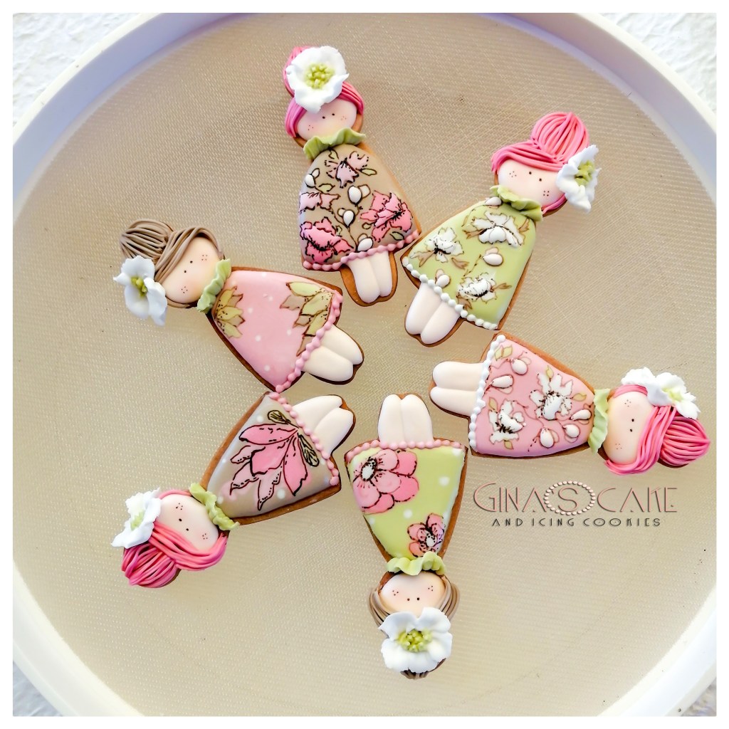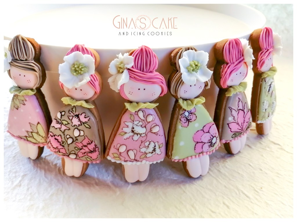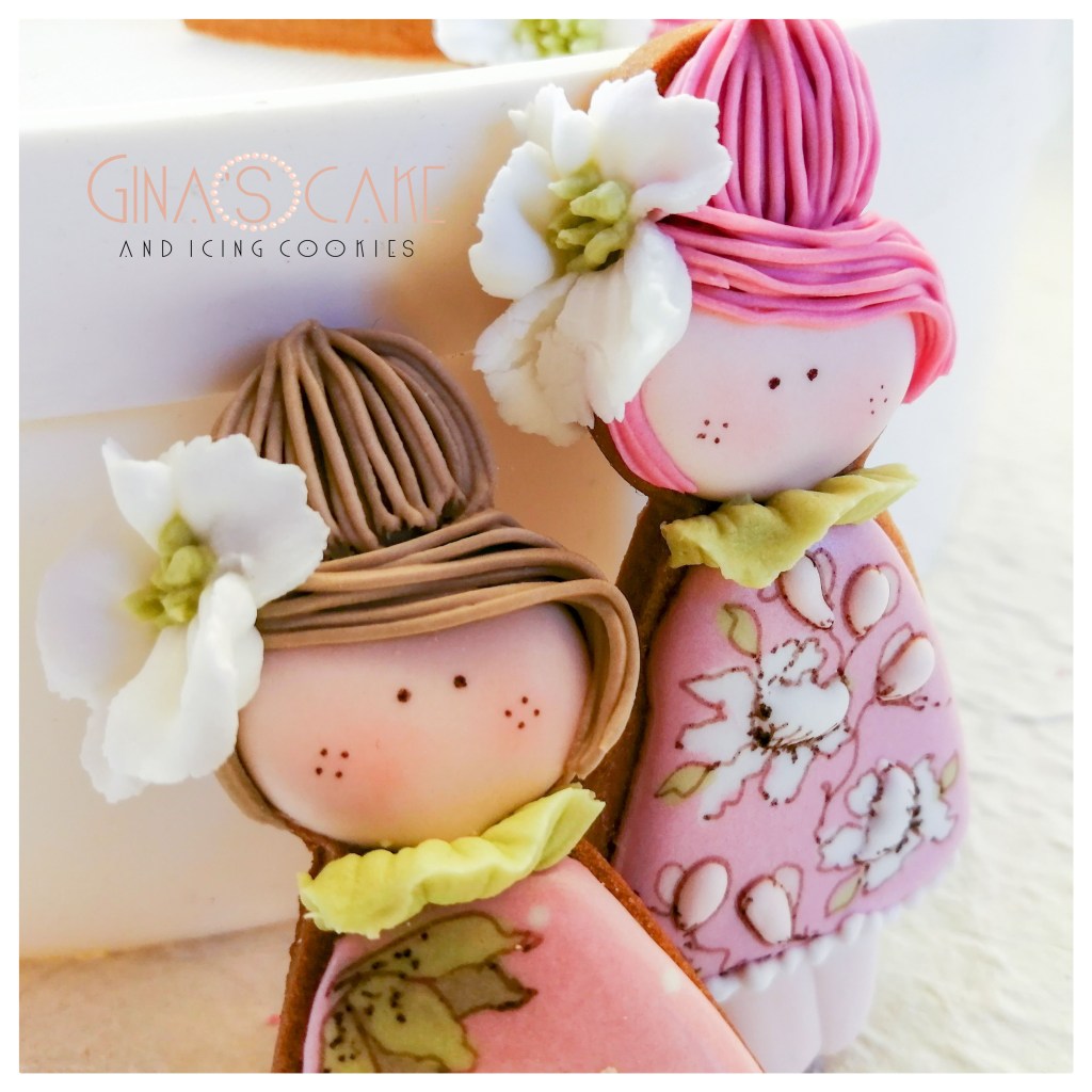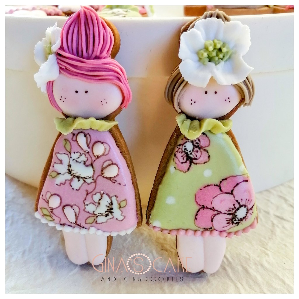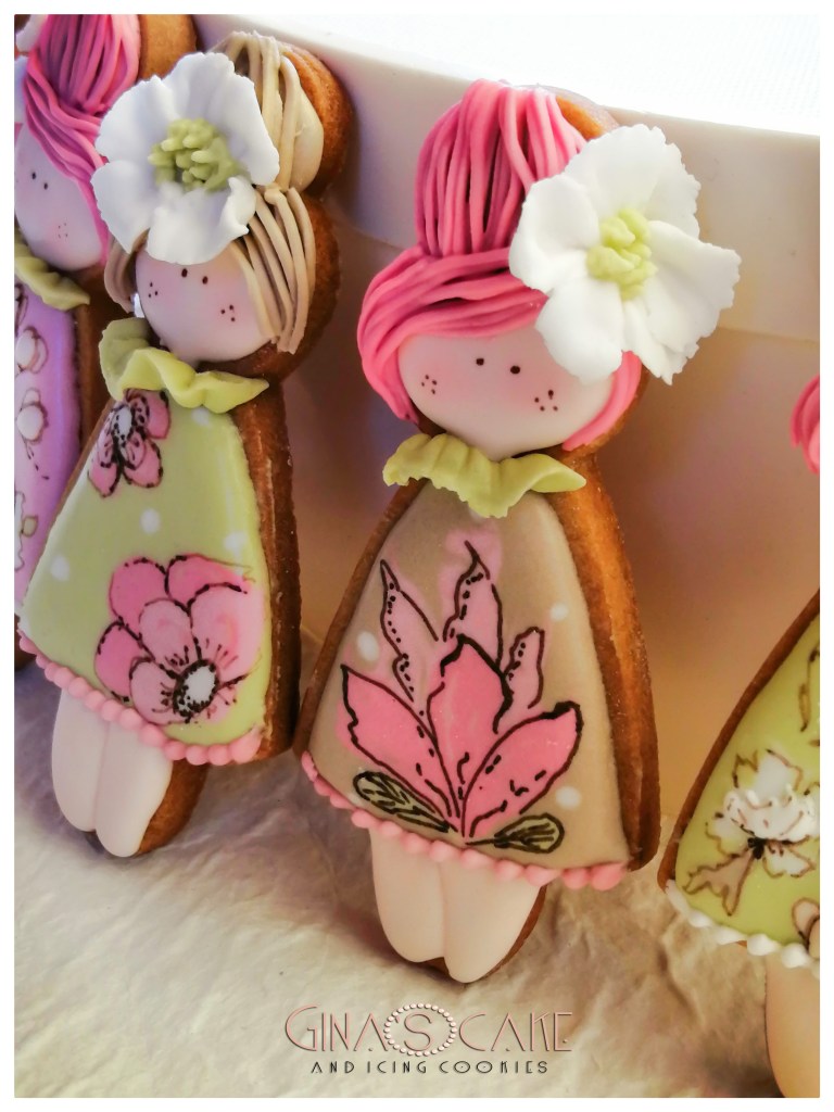 Ci sono poi quei biscotti che decori senza un motivo preciso, senza un tema specifico per cui, alla fine, nonostante la soddisfazione per il risultato, non sai quale titolo dare all’articolo che stai scrivendo! E’ il caso di queste piccole cookie dolls, create con un altro cutter disegnato dalla cookier giapponese Shiori Jamamoto in arte @fiocco_cookies. Il caldo estivo favorisce il buon esito della tecnica del wet on wet, che ho utlizzato per la decorazione degli abiti, creando un pattern floreale ispirandomi ai stupendi lavori di Anna Leigh Southworth in arte @tinytudorcookies. I contorni di fiori e foglie sono stati delineati con i pennarelli alimentari Rainbowdust color Chocolate e Chocolate Brown.