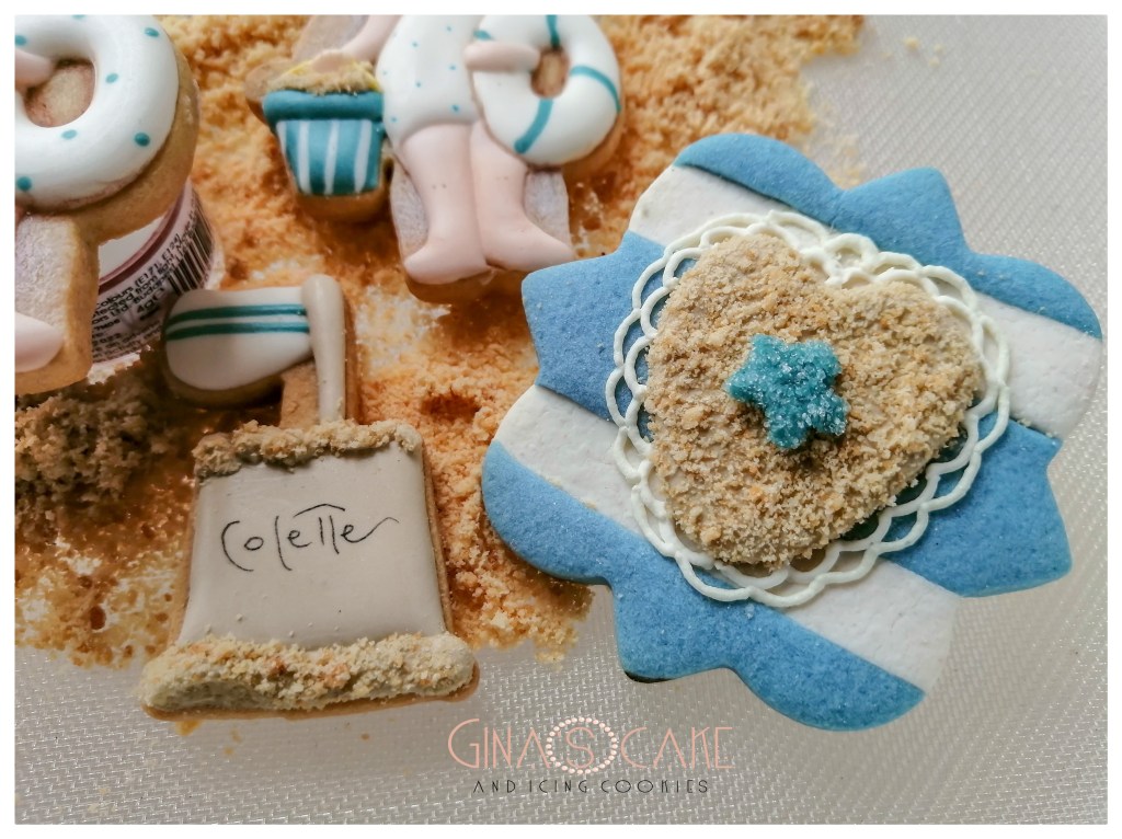 Ho creato la sabbia, sbriciolando dei biscotti avanzati, quindi cotti e mai decorati! Invece la placca bi-colore è realizzata con la pasta frolla colorata, altrimenti detta Bianca Frolla. Di questa frolla, particolarmente adatta per essere colorata e anche modellata, ve ne parlerò ampiamente in un altro articolo che spero di riuscire a preparare al più presto.