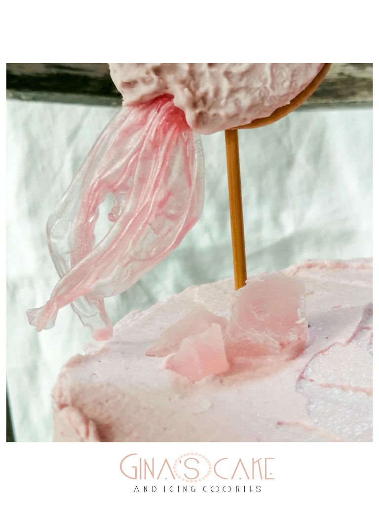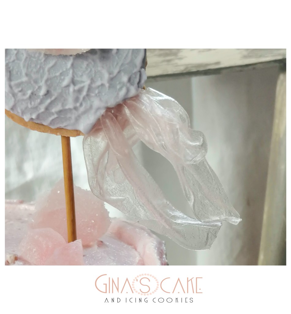 Ecco invece i particolari delle code. Per realizzarle ho colorato l’acqua in cui ho immerso i fogli quadrati di carta di riso. Prima di inserirle sul biscotto e di inglobarle con la ghiaccia dalla consistenza fluida (20 sec.), le ho modellate e ho atteso i necessari tempi di asciugatura.