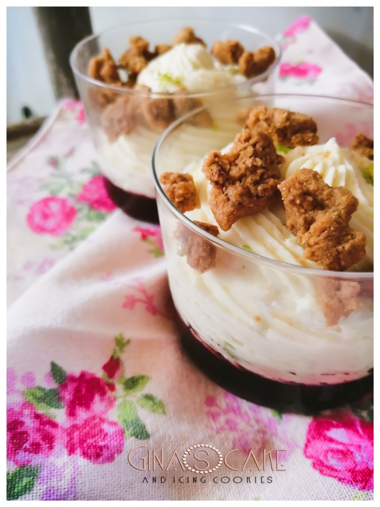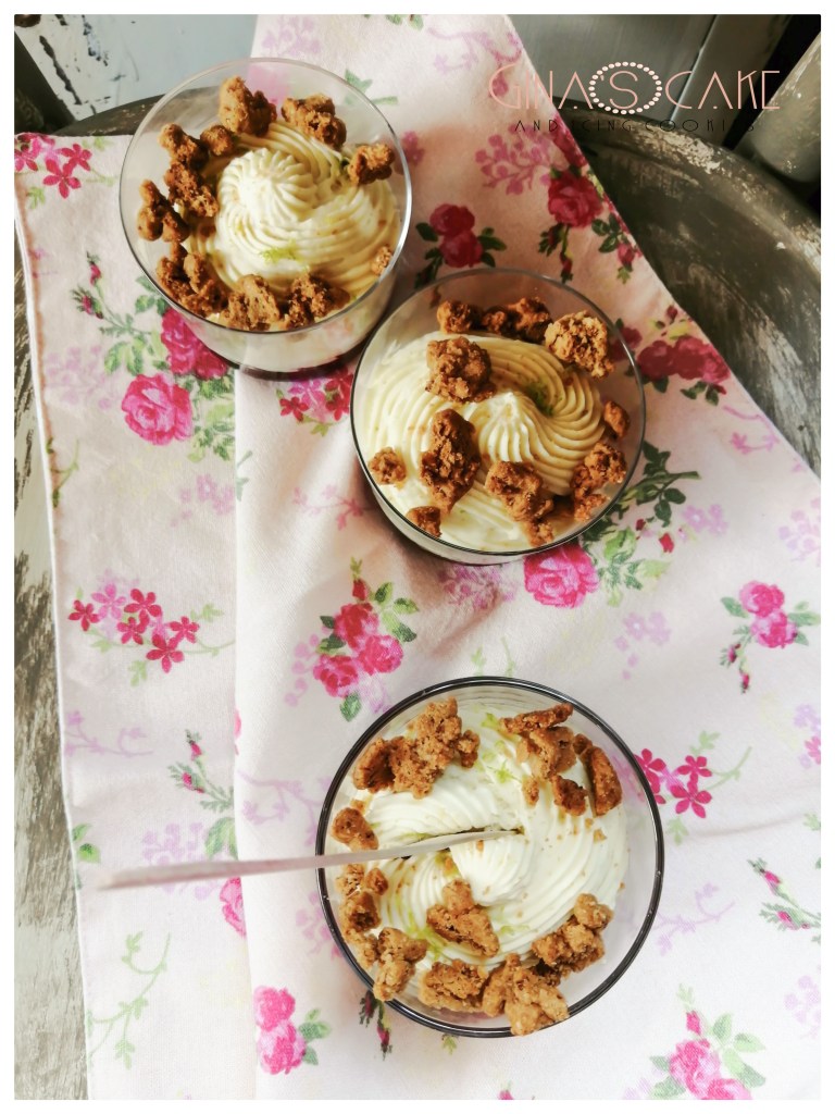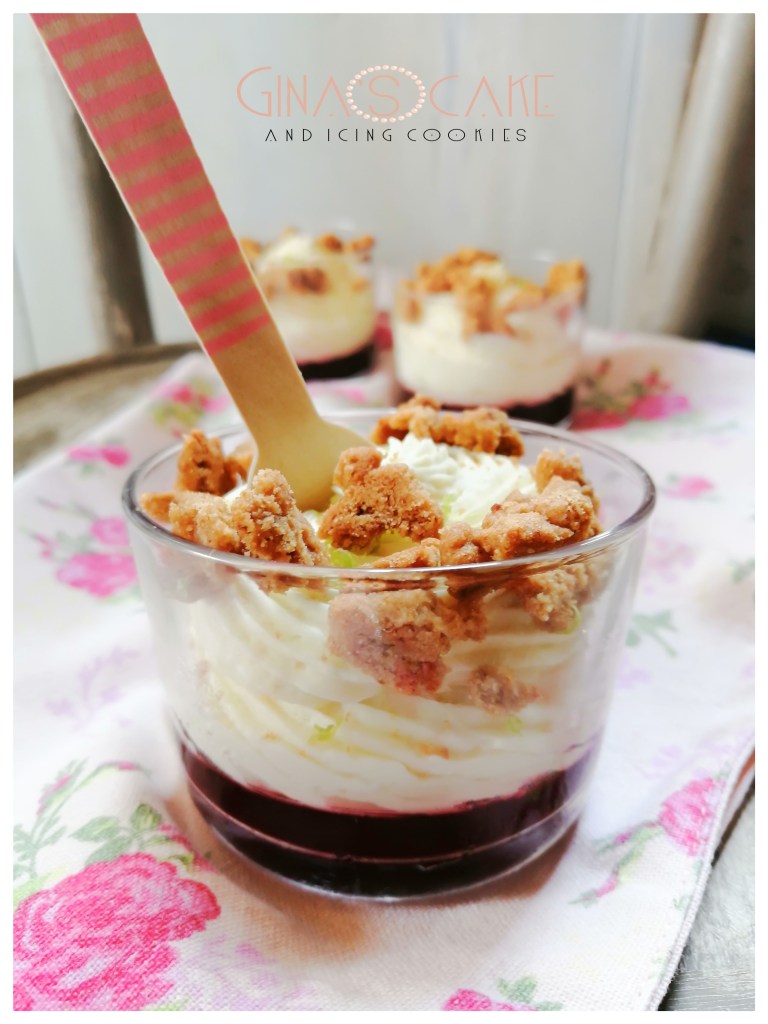 La verrin è composta da una gelèe di fragole e da una mousse leggera al cioccolato bianco, profumata con zeste di lime. La ricetta tratta dal blog “Un dejeuner de soleil”, prevede l’uso di fragole essiccate come elemento decorativo, io invece ho optato per degli streusel.