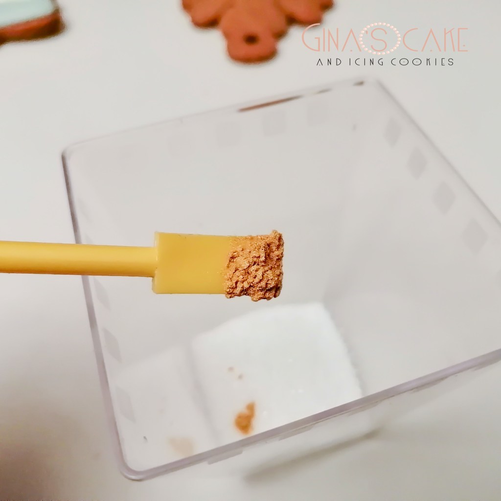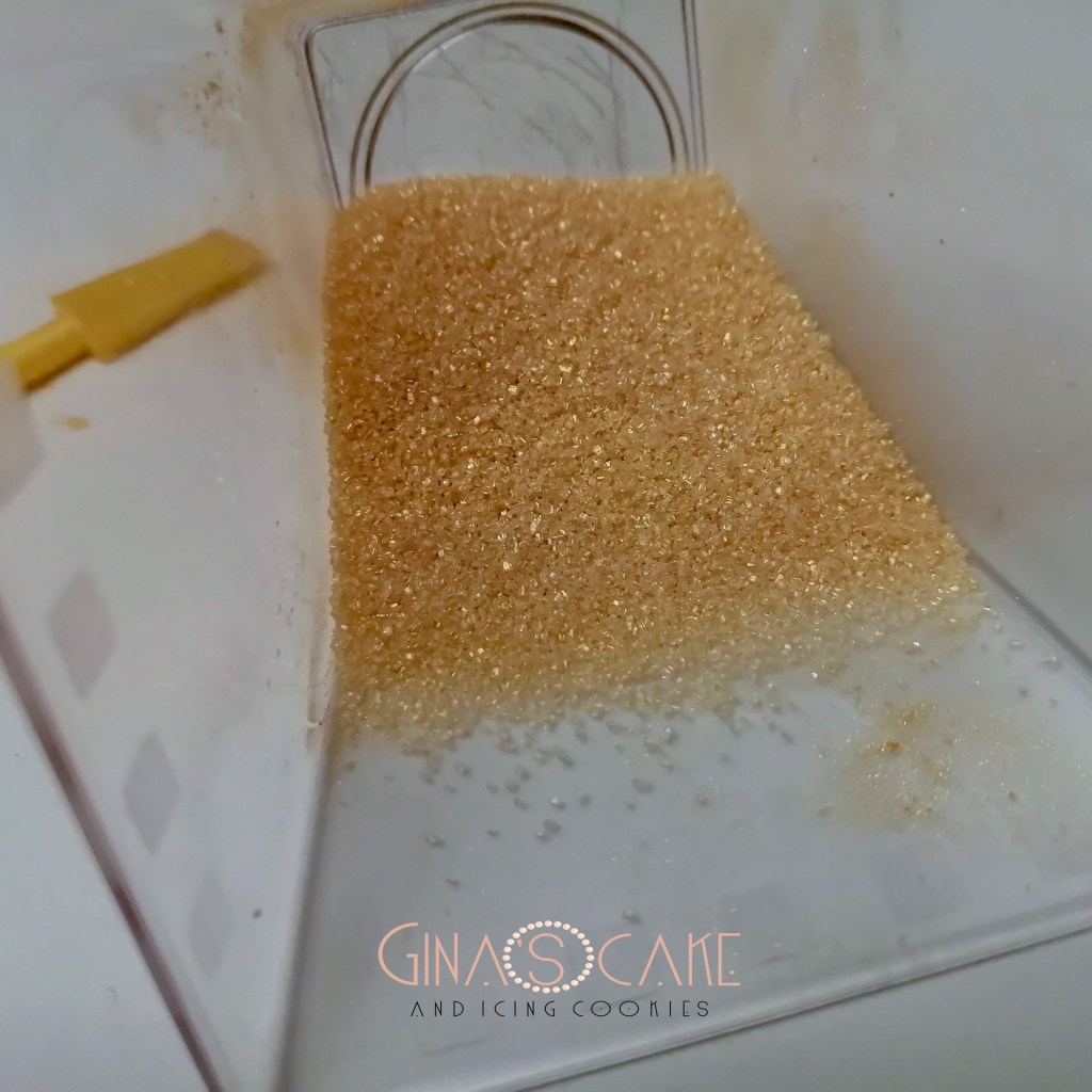 Come si realizzano invece quelle parti glitterate che trovate nella maggior parte dei biscotti presenti in questo set? Ve ne ho già parlato ma siccome sono riuscita a fare qualche foto, con molto piacere, ve lo racconto nuovamente. In pratica, la tecnica di base è sempre quella dell’effetto muschio (clicca qui): basta variare gli ingredienti, solitamente in polvere o in briciole, con cui andrete a ricoprire un riempimento run out “sostenuto” (15-20 sec). In questo caso, quindi ho utilizzato dello zucchero semolato, colorato con dei coloranti in polvere metallizzati.
