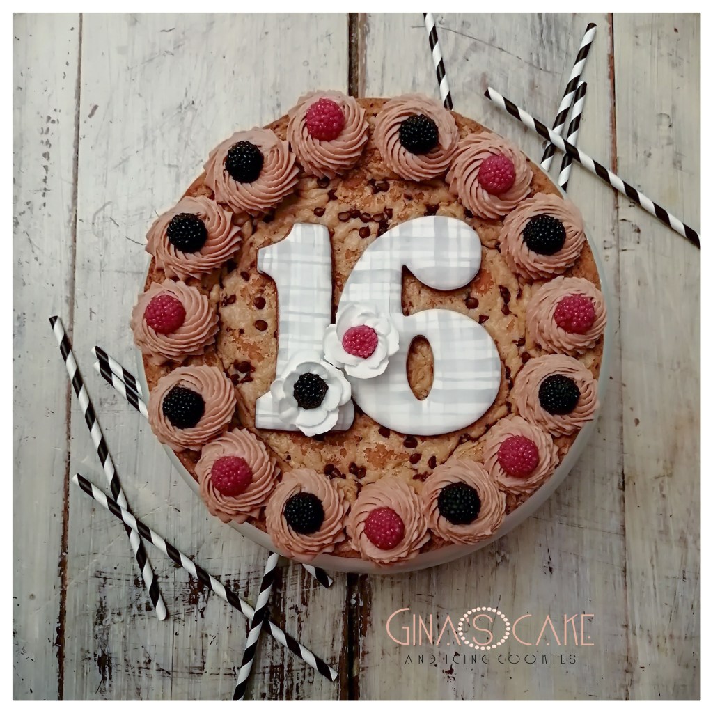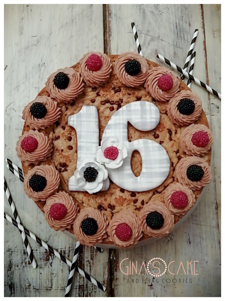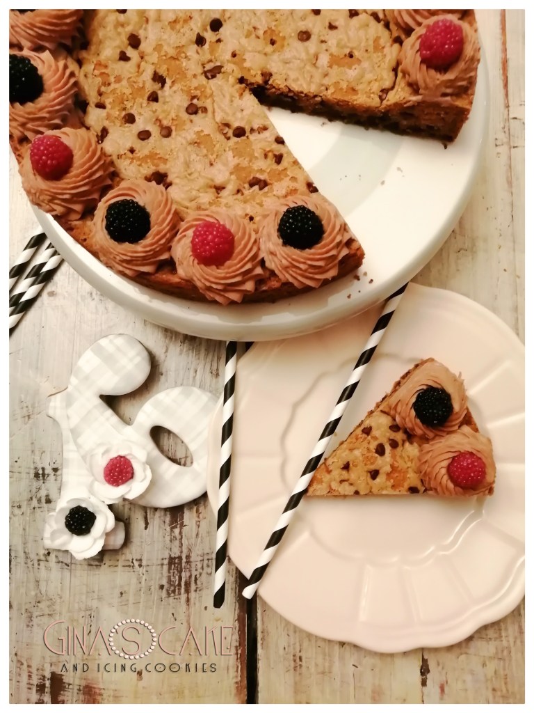 Questa torta facile, sostanziosa, goduriosa e dalla consistenza “chewy” è davvero ideale per le feste di compleanno: i bambini in particolare ma anche gli adulti, apprezzeranno! E poi, particolare non da poco, si prepara davvero in poco tempo: in due ore, a partire dal peso degli ingredienti, fino alla posa dell’ultimo dettaglio decorativo, si ottiene il risultato che vedete in foto. La fase più lunga, come sempre, è data dalla decorazione dei biscotti decorati con ghiaccia, se pensate di usarli, ovviamente, per cui dovrete organizzarvi per tempo, diversamente, il problema non si pone: l’espressione ” detto fatto” calza infatti a pennello con questa preparazione. Non vi resta quindi che fidarvi di me e tenervi la ricetta a portata di mano, come farò io. Credo che la mia produzione di Chocolate Chip Cookie Cakes non finirà qui (proverò anche le varianti) perchè direi proprio che possano tranquillamente entrare a far parte delle TORTE VESTITE DA TORTE.