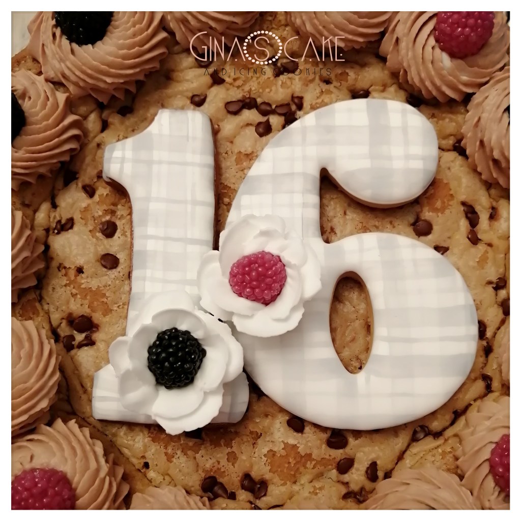 Il numero 16, decorato con ghiaccia reale, è dipinto a mano libera. I cutters in rame sono di Cutterspepe.