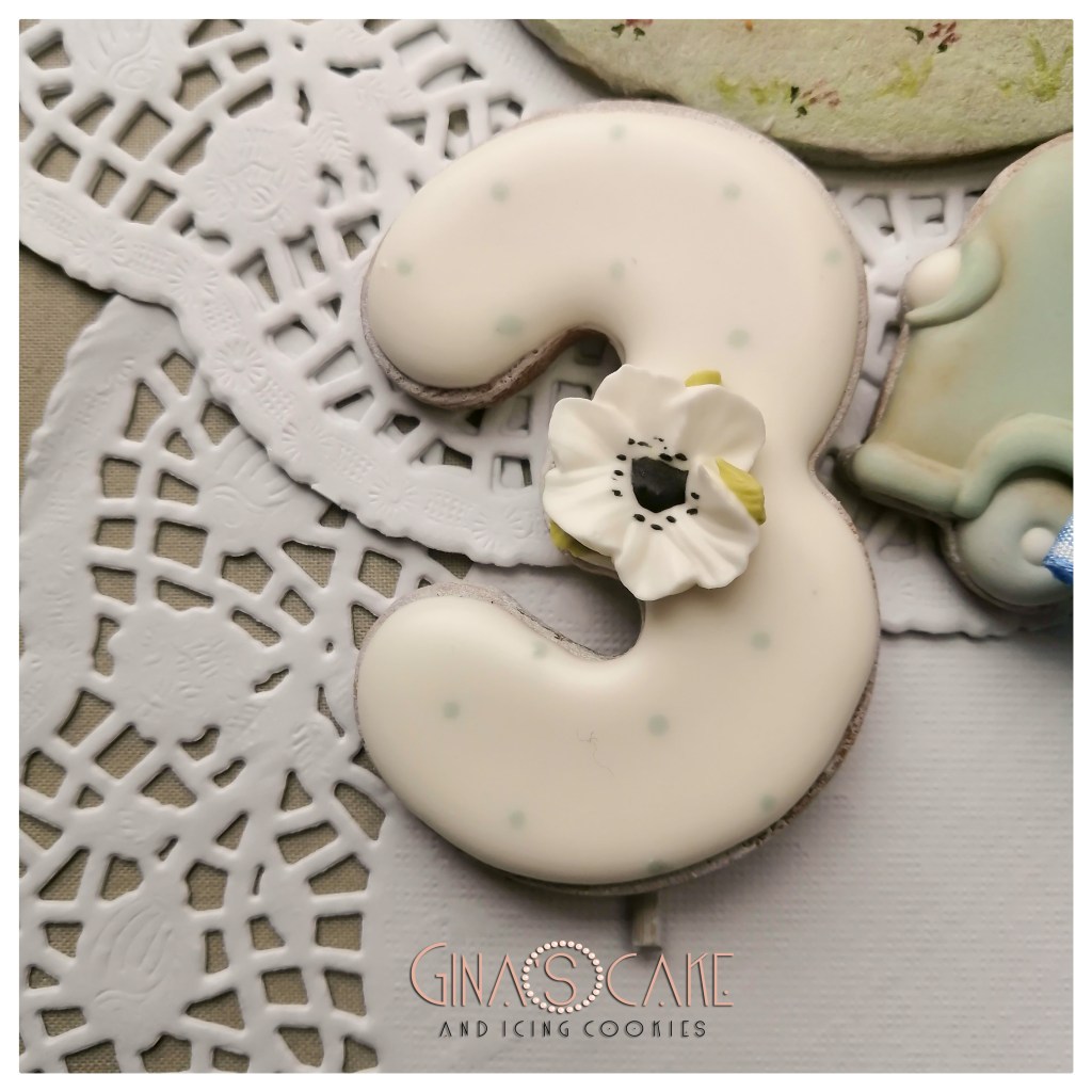 Pronti a festeggiare il terzo compleanno di Nicolò con un cookie cake topper e biscotti ricordo per gli invitati.