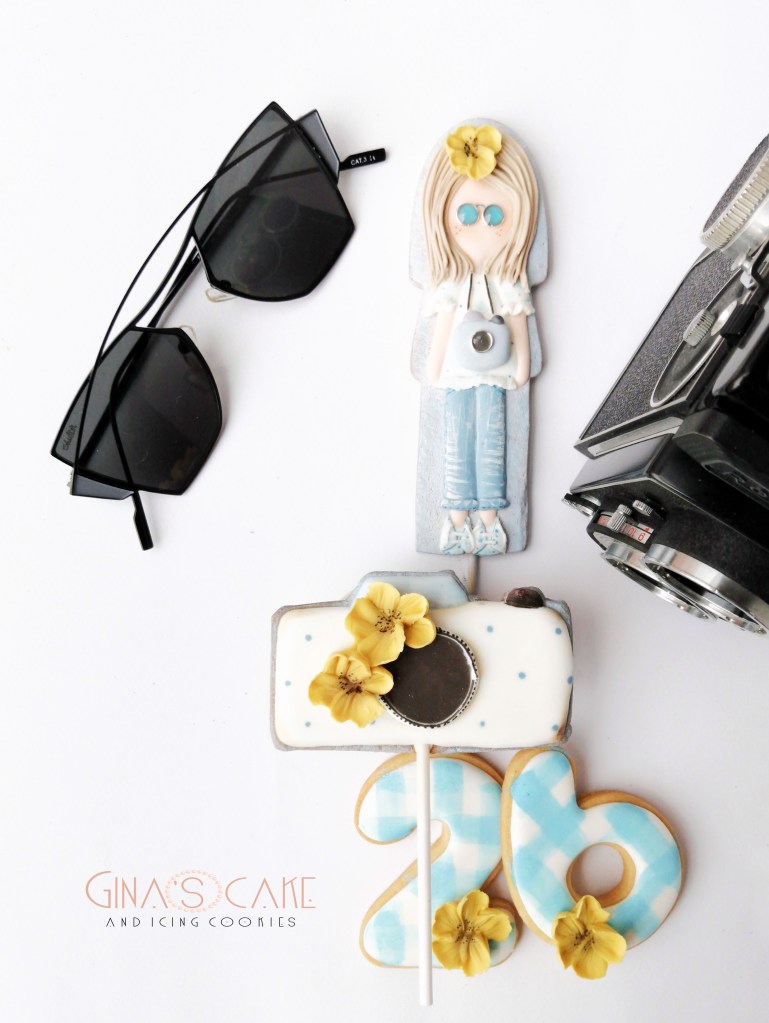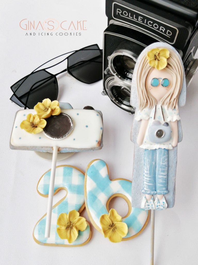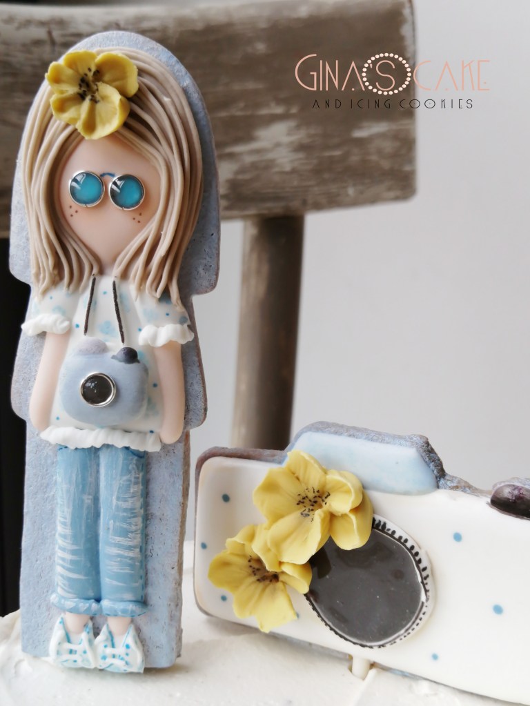 Tornando a parlare delle torta, mi vorrei soffermare sui dettagli che accomunano due biscotti su quattro: le lenti degli occhiali e delle fotocamere sono in gelatina, o meglio, in Piping Gel Wilton. Come ricorderete, oltre ad aver imparato a realizzare il piping gel home made (clicca qui), per fare gli occhiali di precedenti cookie dolls (clicca qui), avevo utilizzato il prodotto Argel di Gina Assini. In questo caso, ho voluto finalmente provare il prodotto Wilton, di cui sinceramente non mi fidavo tanto, rispetto ai tempi di asciugatura. Artgel assolve bene questo compito ma non può essere applicato direttamente sulla ghiaccia reale perchè una volta asciutto non vi aderisce e si stacca quindi gli occhiali, in questo caso, devono essere creati a parte e poi applicati sul viso della bambolina. Il piping gel invece può essere applicato direttamente sulla ghiaccia asciutta perchè vi aderisce perfettamente, creando un tutt’uno. Ricordate l’effetto vernice delle scarpe e accessori della Paper Doll Mademoiselle? (clicca qui).