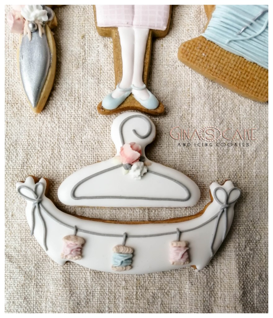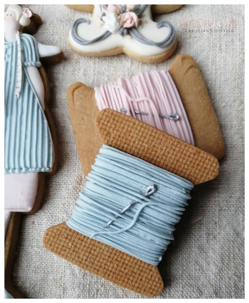 Non avete idea di quanto mi sia divertita nel preparare questo set! Era da tanto che ce l’avevo nel cassetto e in questi giorni, finalmente sono riuscita a realizzarlo! Il tema del cucito non è nuovo, infatti curiosando sul web ne troverete svariati set con relativi cookie cutters. Io ne ho fatto un mix, utilizzando quelli che avevo a disposizione. A dirla tutta, avevo preparato anche la macchina da cucire ma purtroppo al momento di decorarla, il biscotto si è rotto e così ho dovuto rinunciarvi. Questo mi insegna che non bisogna mai abbandonare la buona abitudine di cuocere qualche biscotto in più, come rapido rimedio a incidenti di questo tipo!