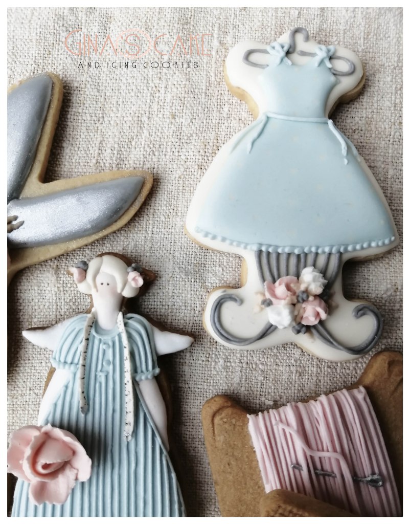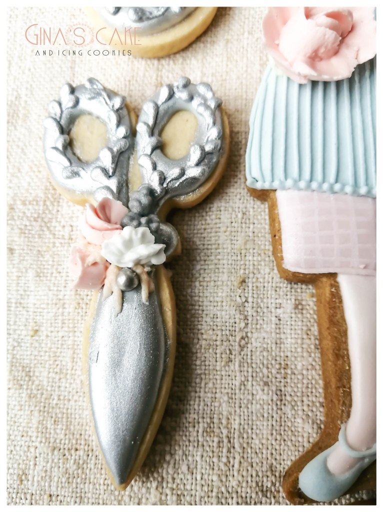 Come dicevo, il tema del cucito così come quello del ricamo, nell’ambito della cookie art, sono alquanto consueti, io però ho cercato di “umanizzarli” introducendo il mestiere corrispondente a tali attività. Del resto, la creazione di personaggi di fantasia, resta pur sempre la mia attitudine preferita. Non mi resta quindi che presentarvi la Sarta Brunilde!