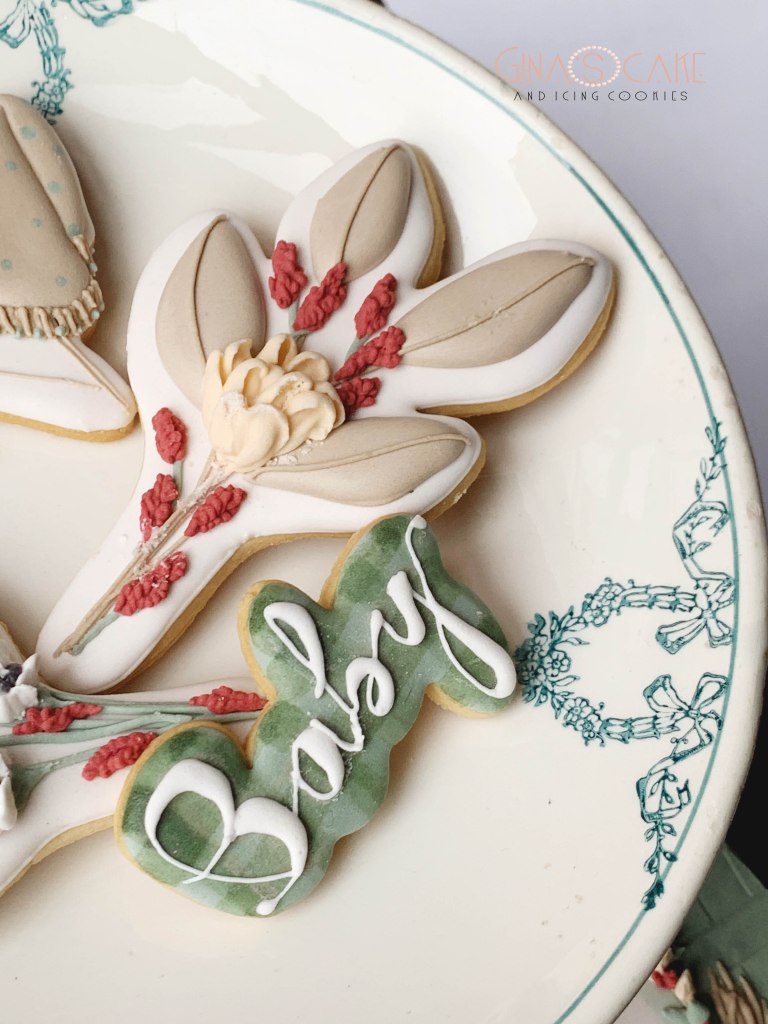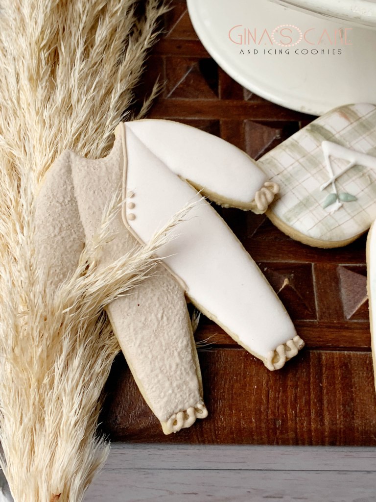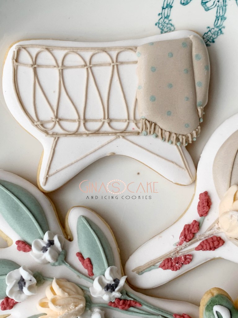 Il pattern vichy è stato realizzato con il pennello anzichè con l’aerografo, come ultimamente mi piace fare. La lettera A e la scritta BABY sono state realizzate a mano libera o meglio, a sac a poche libera nel senso che ho scritto direttamente sul biscotto senza alcun aiuto, non ho quindi ricalcato nè tanto meno proiettato alcun che. Il motivo è semplice: non posseggo un proiettore! E’ uno di quegli strumenti su cui non mi sono mai decisa a fare un investimento: è vero che non costa poco , però merita davvero l’acquisto? La risposta è ovviamente soggettiva…..a cominciare dalla disponibilità finanziaria infatti, se avessi disponibilità economiche consistenti avrei già acquistato una stampante 3D per crearmi i cutters e una macchina Cricut per gli stencils. Ma al di là di questo, tecnicamente parlando, quindi ai fini del risultato finale , è indispensabile avere un proiettore? La risposta è NO. Certo è ottimo per realizzare ogni tipo di scritta in quanto se non si possiede un’abilità grafica, il proiettore compensa alla grande questo limite ma se minimamente si ha una buona coordinazione oculo manuale, allora si può benissimo sopravvivere senza. Una cosa però la voglio dire: è inutile avere tanti strumenti iper tecnici se poi non sappiamo fare la ghiaccia! Ho visto scritte realizzate con font bellissimi grazie al proiettore ma con un risultato finale proprio bruttino (mi sto trattenendo nel non dire altro) a causa della texture e della consistenza errate della ghiaccia. La mia scritta Baby è imperfetta graficamente perchè come dicevo l’ho creata a mano, di getto, però almeno la ghiaccia è corretta. Come si correggono le imperfezioni? La risposta è sempre la stessa: solo con il continuo esercizio, aspetto su cui purtroppo, riguardo alle scritte sono alquanto carente. E’ anche vero che la scrittura con la ghiaccia reale così come con il cioccolato o altri composti edibili richieda un approfondimento specifico.