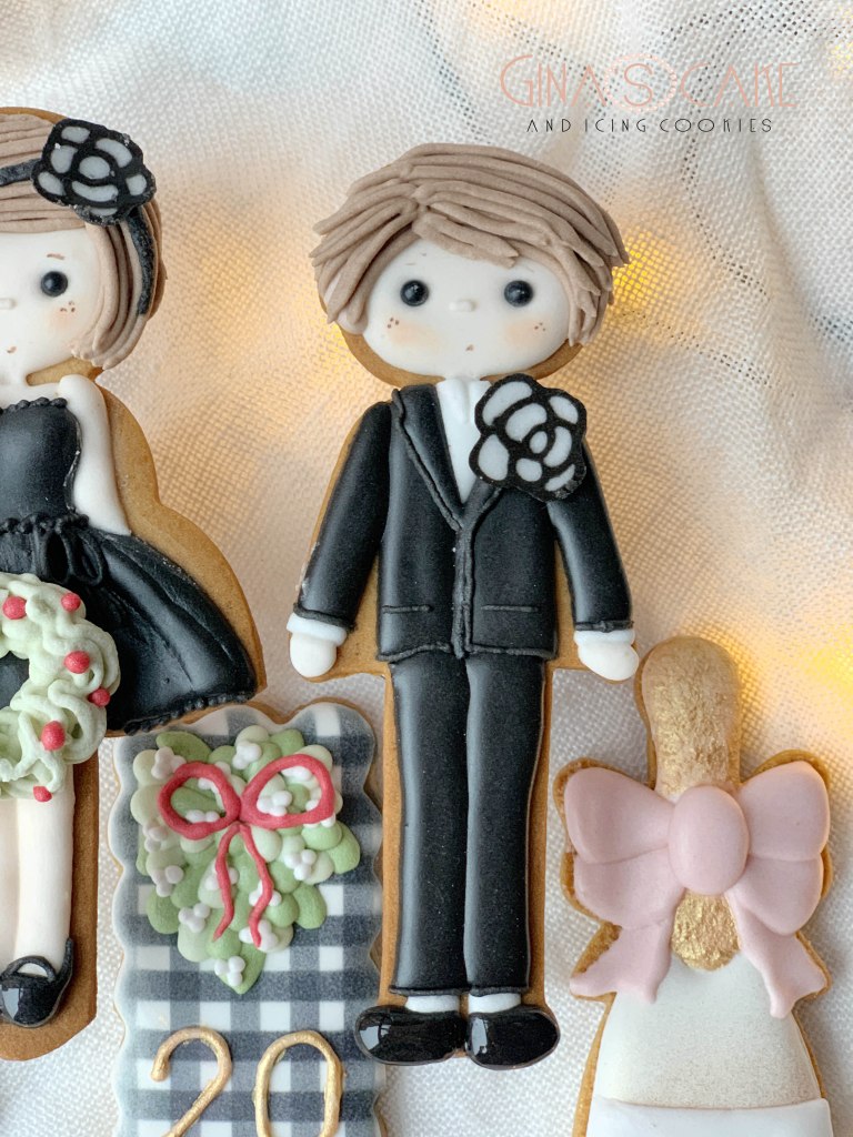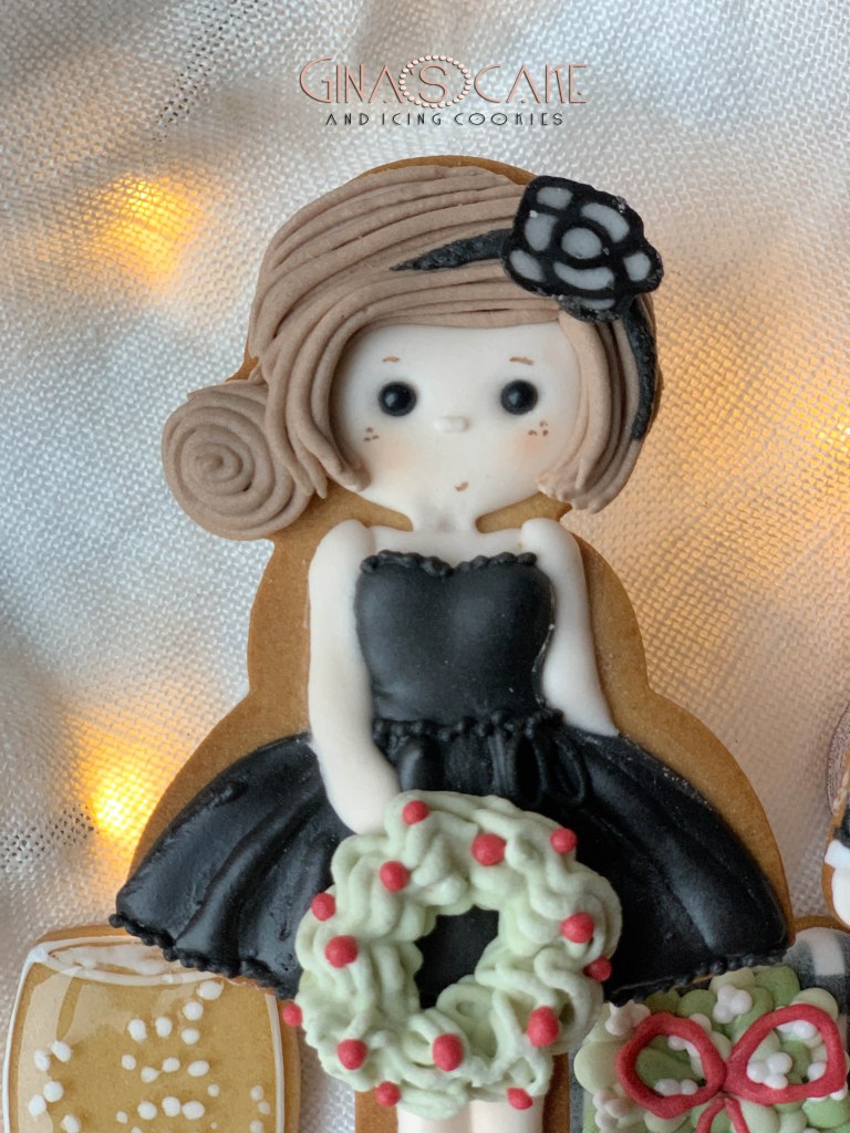 Avete notato qualcosa di diverso nella cookie doll? Osservatela bene e noterete che che ha il seno ma non solo! E’ la prima volta infatti che realizzo l’intero corpo della bambolina per poi aggiungere in un secondo tempo il vestito. Prima di questa occasione, non l’avevo mai fatto in quanto non volevo rendere il biscotto troppo pesante, cioè troppo carico di ghiaccia reale (non bisogna mai dimenticarsi che questi biscotti, in teoria, sono fatti per essere mangiati!), per cui, dal collo alle ginocchia le parti del corpo erano realizzate attraverso il vestito della bambola. Creando invece il tronco e le gambe complete si crea maggior volume rendendo il tutto un tantino più realistico, ovvero quel poco che mi basta perchè come sapete, il mio stile di decorazione, è volutamente distante dall’iperrealismo.