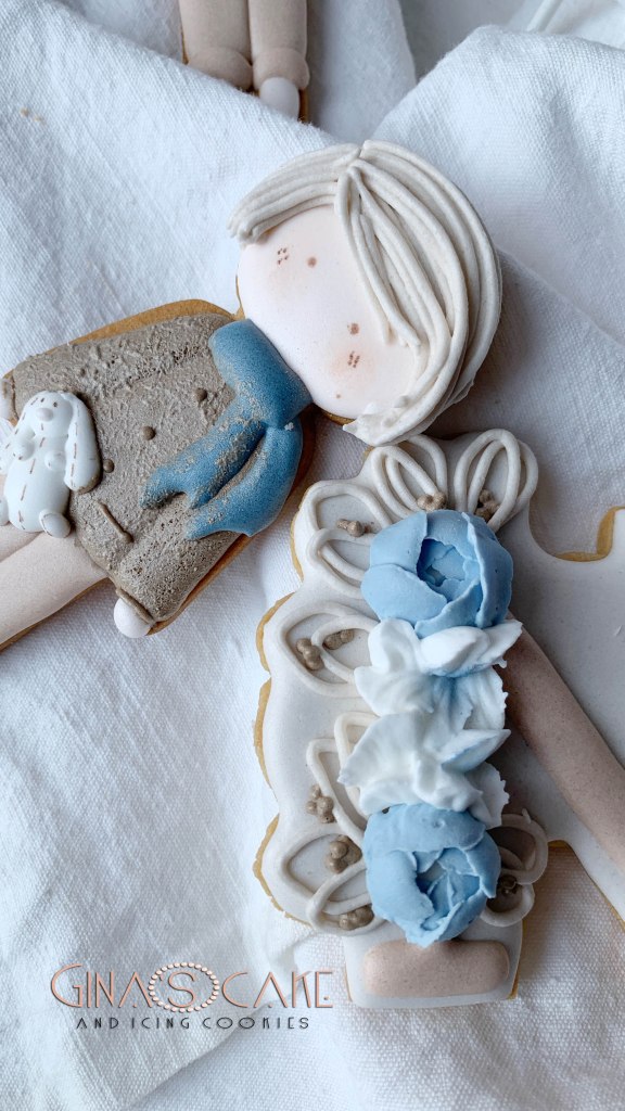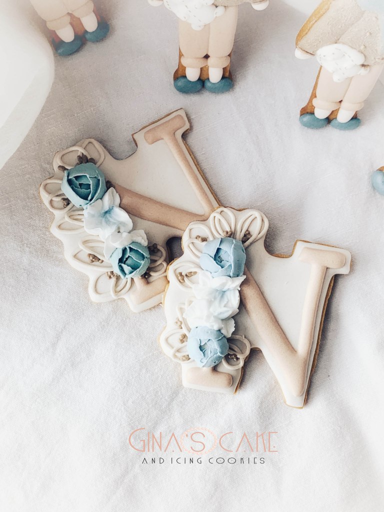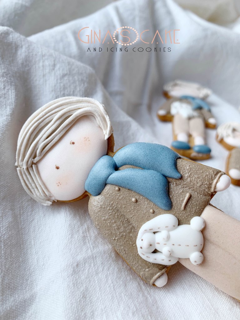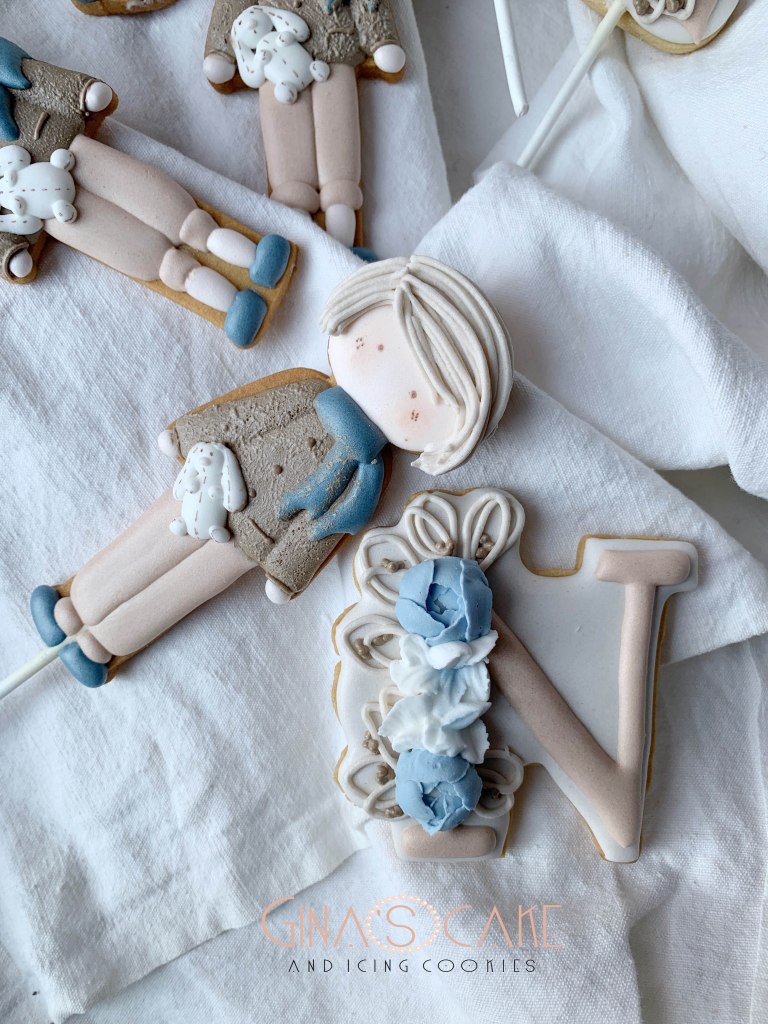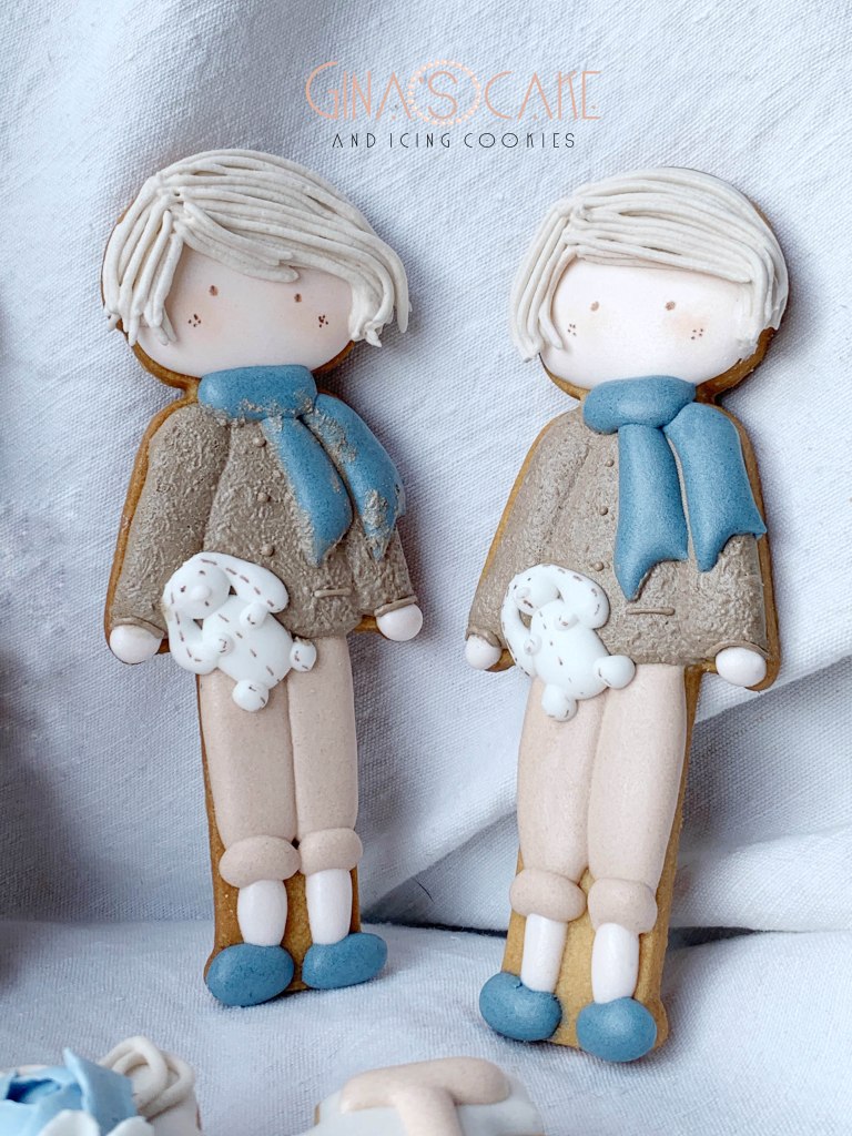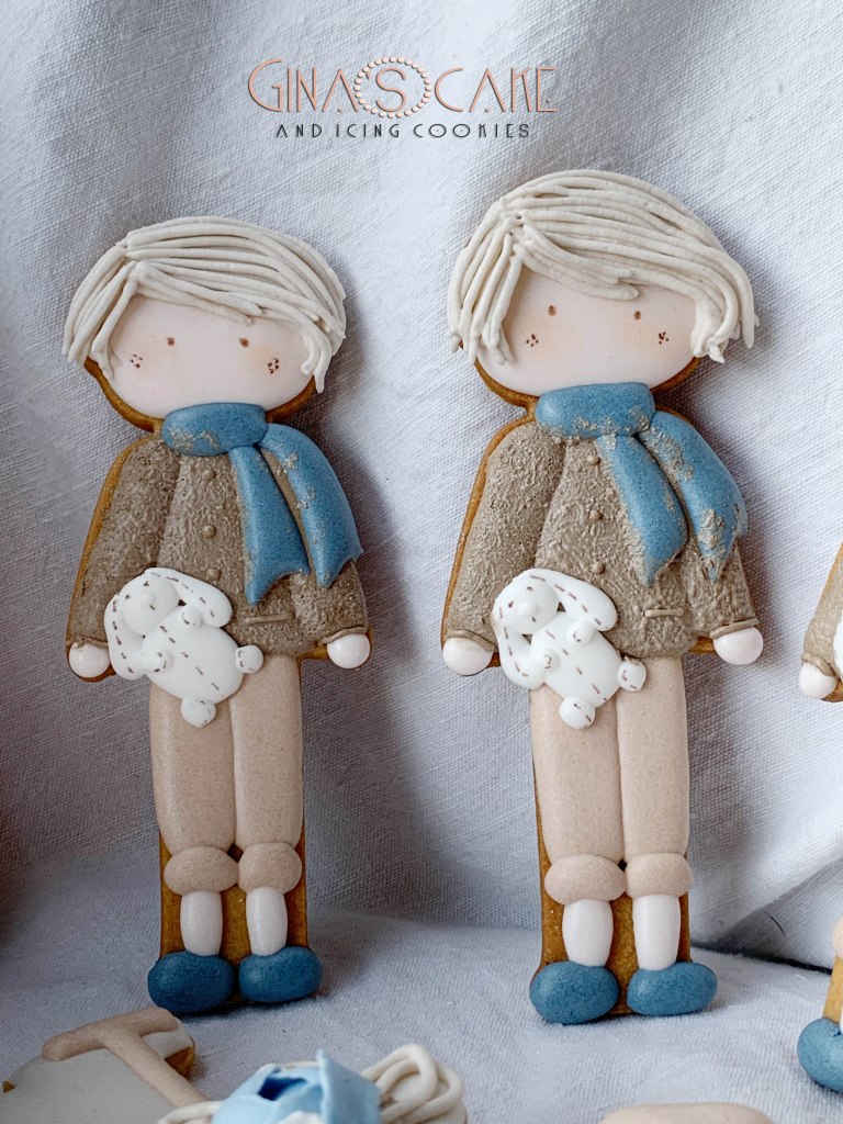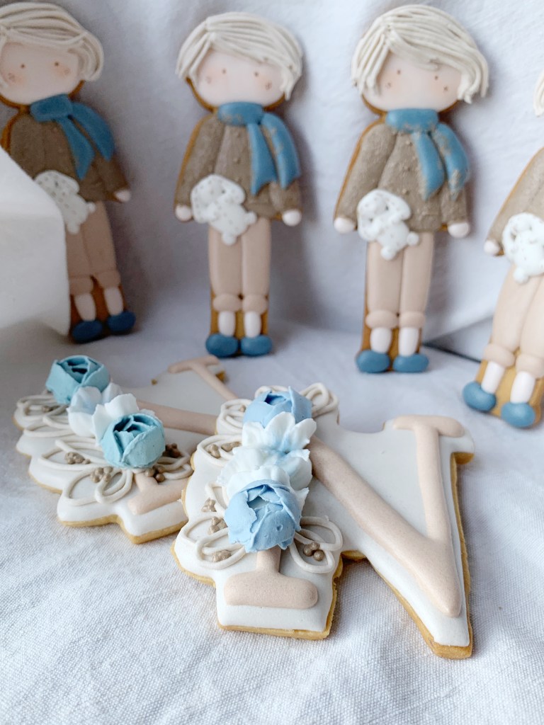 A volte può succedere che i miei biscotti vadano ad integrarsi ad altri elementi riconducibili ad uno specifico tema, solitamente scelto ad esempio, per una festa di compleanno. Come spesso accade però, il tutto viene fatto quasi alla cieca nel senso che, a causa della lontananza con il committente, mi succede di non avere la possibilità di vedere dal vivo gli altri dettagli dell’allestimento, per cui per realizzare i biscotti mi baso sul racconto o su qualche immagine indicativa. E’ proprio il caso di questi maschietti a cui si aggiungono le lettere N e il numero 2, preparati per il compleanno di Nicolò. Il tema della festa era il bosco, I colori e i dettagli del bambolotto, sono ovviamente stati decisi dalla mamma del festeggiato. Il bambolotto doveva comunque riprendere il più possibile la versione in pezza, creata appositamente dal brand “Le piccoline del cuore” (se vuoi vedere il bambolotto in pezza originale clicca qui).
