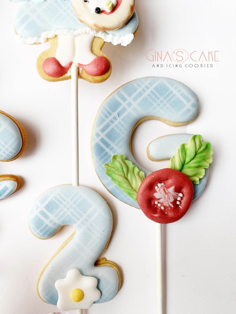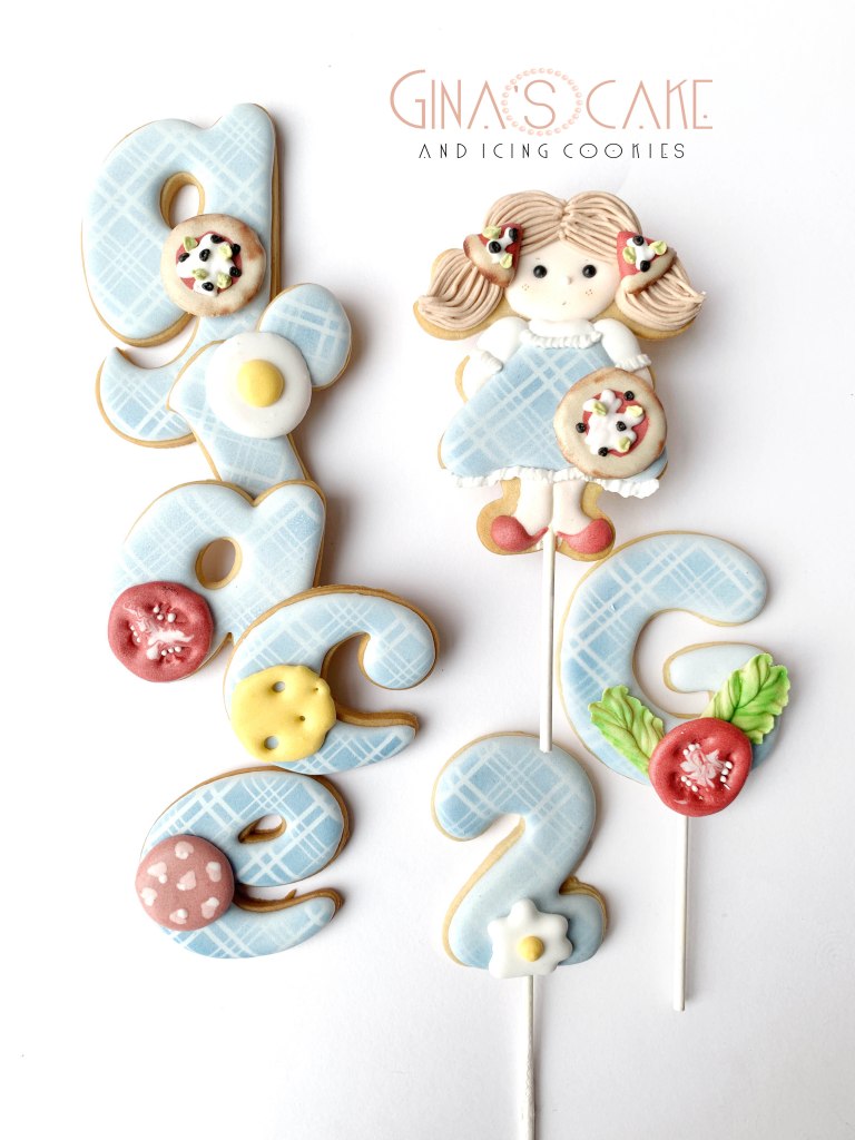 In particolare questi erano i biscotti per la torta: cookie dolls, iniziale del nome e numero due su stecco e poi la scritta Grace da appoggiare sul piano del tavolo.