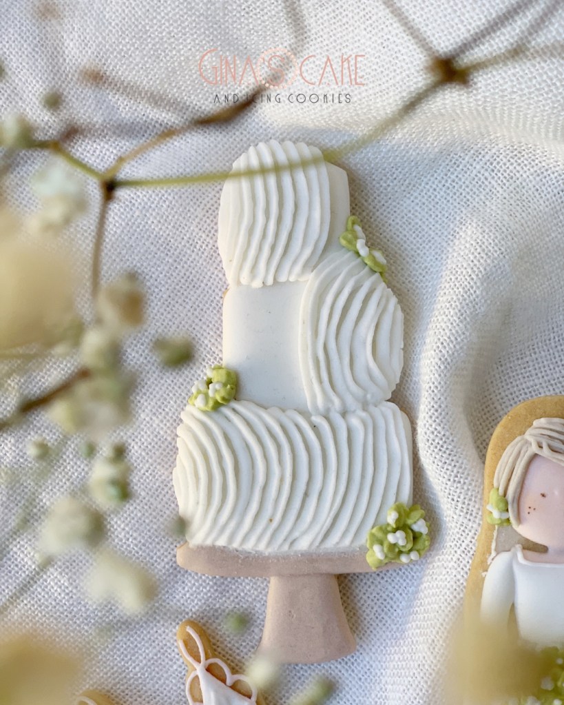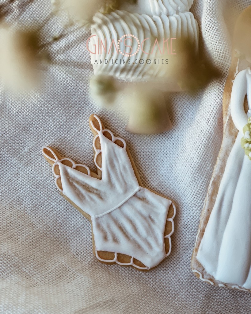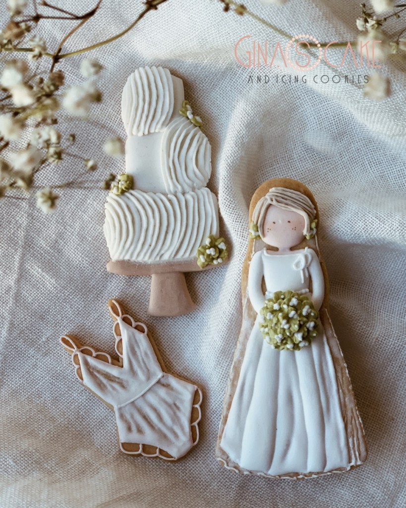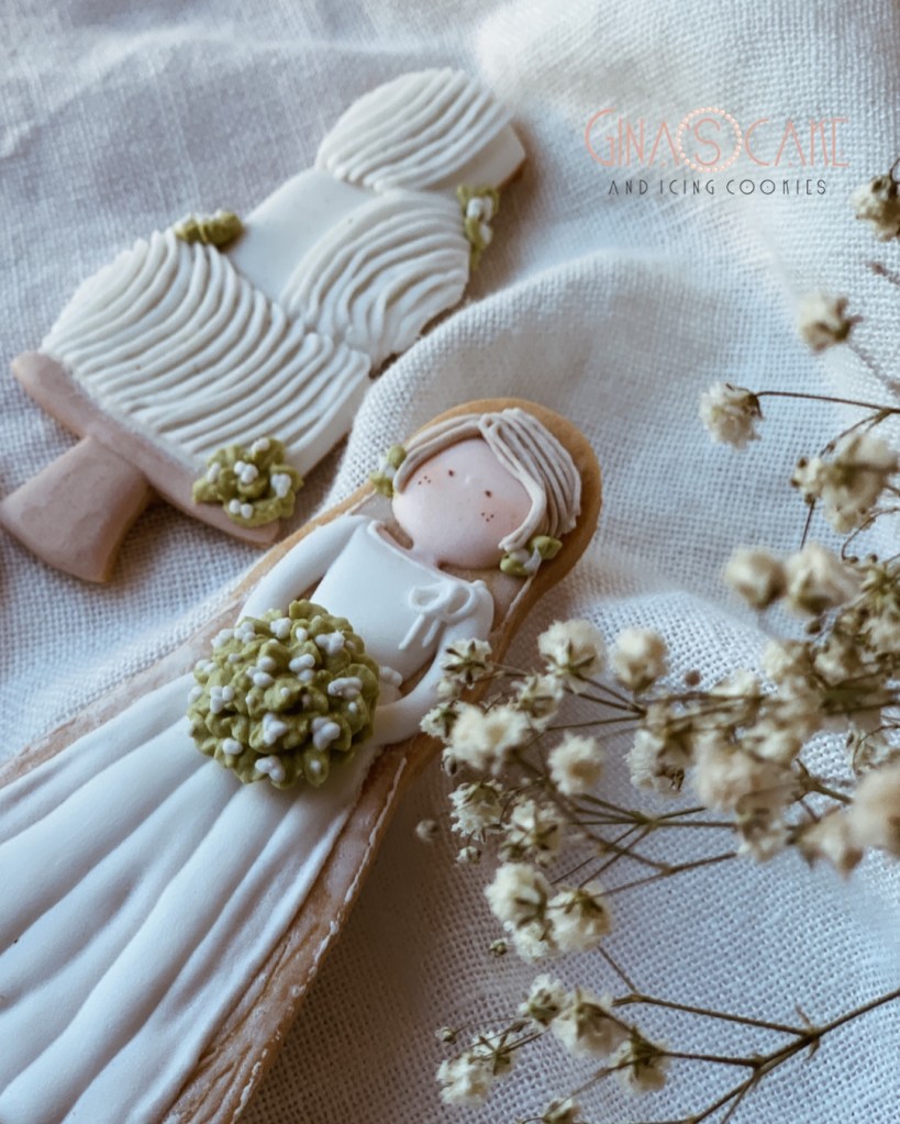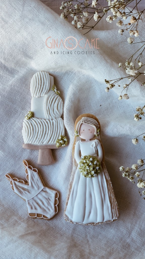 I biscotti di oggi sono in un certo senso l’integrazione al set “Le amiche della sposa” tanto che la Sposa, appunto, è la stessa! Avevo semplicemente voglia di inserire questa torta nuziale e il body, viste le particolari tecniche usate.