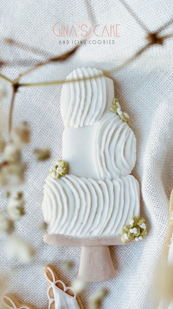 Per l’effetto ruches della torta, che a me ricorda quelle decorazioni multistrato in wafer paper o pasta di zucchero, ho utilizzato la tip 101s Wilton e la ghiaccia dalla consistenza stiff. Il tutto ovviamente realizzato su una base run out completamente asciutta.