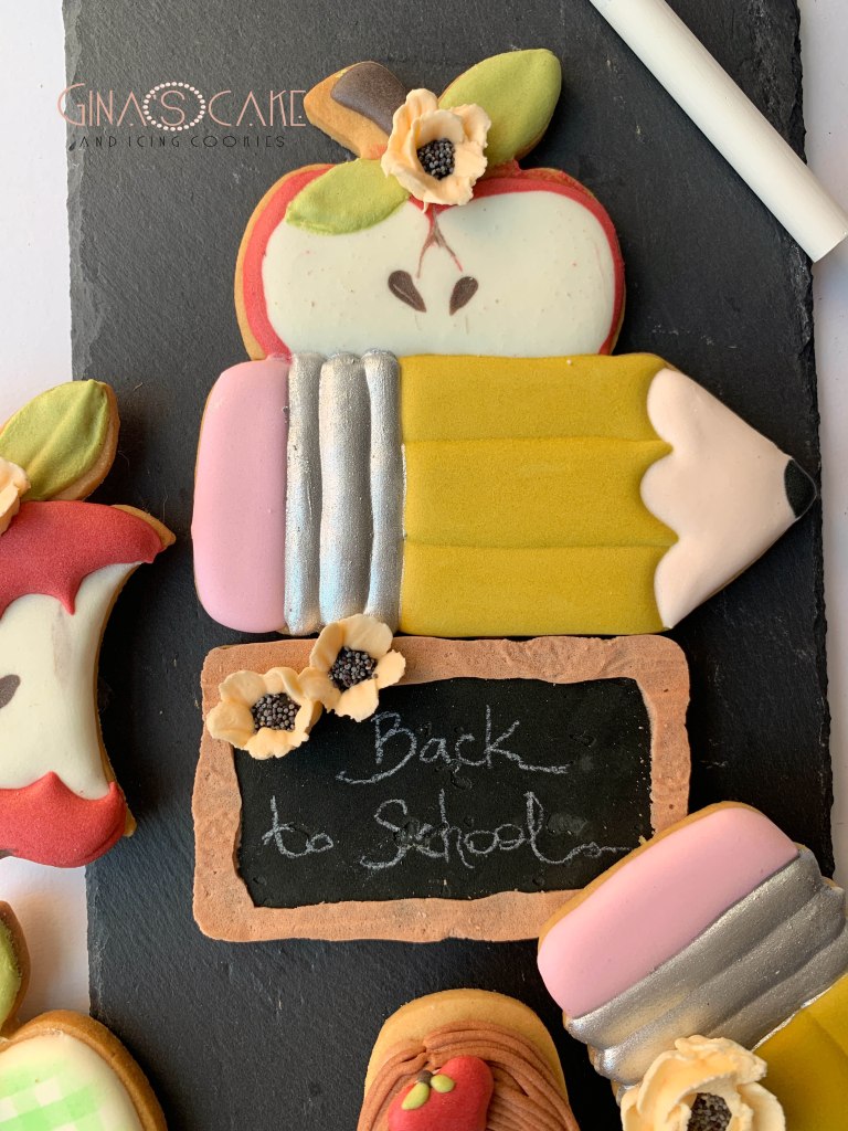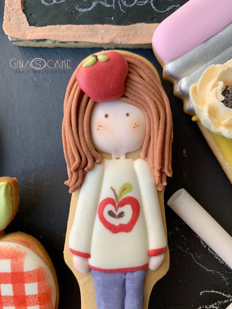 Il tema del set è ormai un classico, visto che qui in Italia, che amiamo americanizzare tutto, ci siamo adattati a una sorta di celebrazione del “Back to school”. L’anno scorso non preparai nulla, nei due anni precedenti fui sicuramente più fantasiosa di quest’anno dove mi sono limitata a realizzare dei soggetti scontatissimi quali la matita, la mela e la lavagna: l’unica nota personalizzata è sicuramente la mia cookie doll, realizzata con un cutter di Postreadiccion.