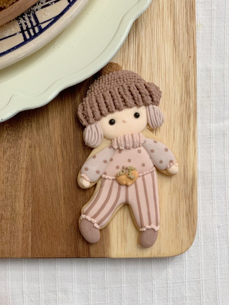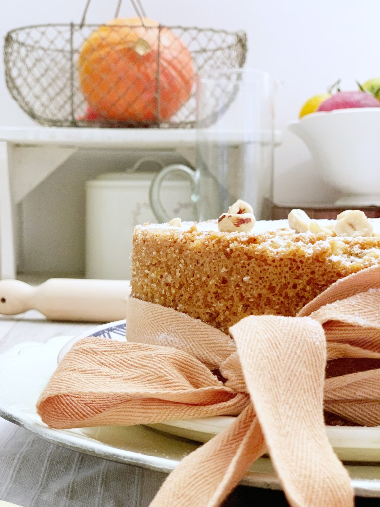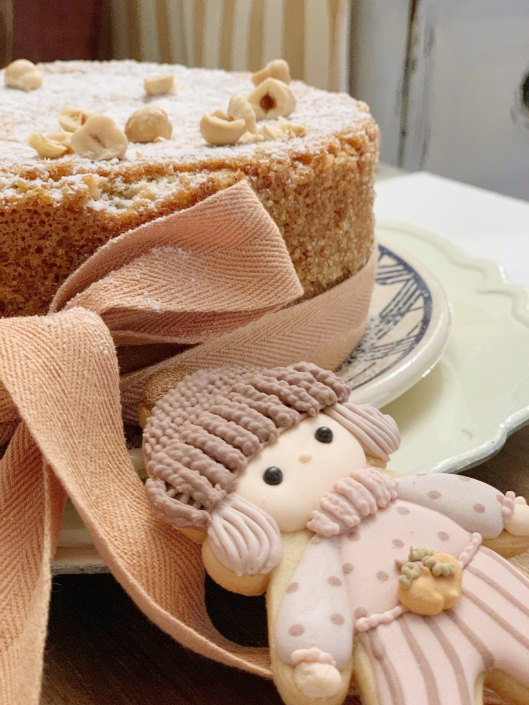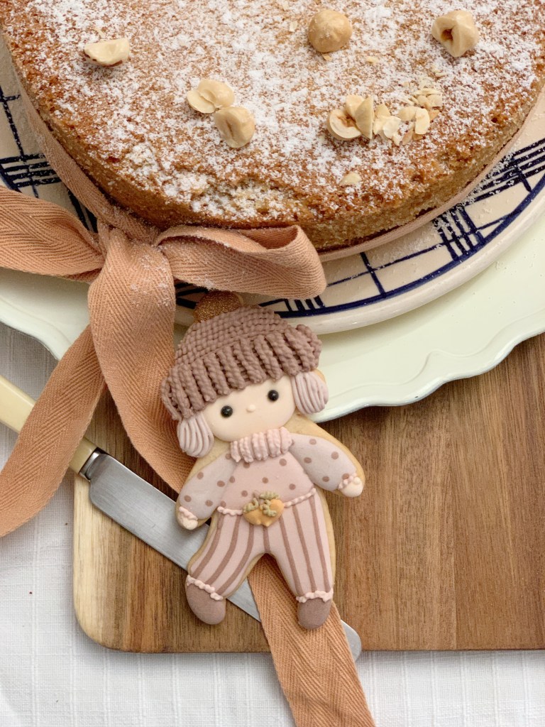 Basta poi un nastro e un biscotto per dare un tocco in più ad una torta che è soprattutto buona e goduriosa! Il biscotto che accompagna questo dolce è una cookie doll che avete già visto tra i soggetti del corso che ho tenuto a Milano il 1°Ottobre scorso: però ha il vestito diverso. Se avessi saputo che mi sarebbe servita per “descrivere” la torta di oggi, avrei creato i dettagli del set a tema nocciola anzichè zucca!