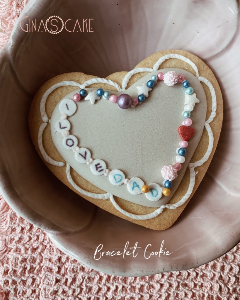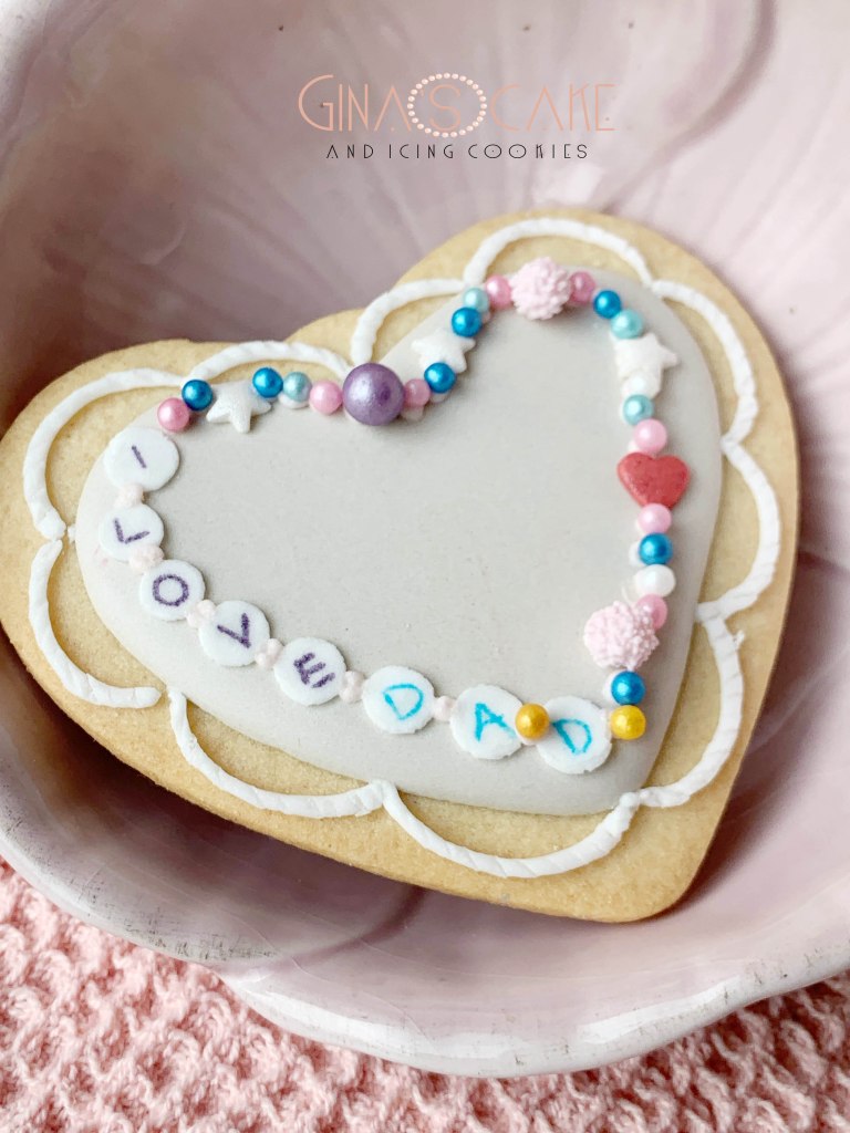 Siccome mi avanzavano un cuore con la base run out già asciutta e della ghiaccia bianca, non ho dovuto mettere in atto tutta la macchina organizzativa per provare a realizzarne uno. Sono veramente semplici da creare, oltre alla ghiaccia basta avere degli sprinkles a portata di mano….del resto chi non ne ha? Oltre a mettere in fila le varie perline (potete sbizzarrirvi con forme e colori), si devono realizzare le piccole piastrine su cui riportare le singole lettere (nel mio caso, ho scelto la frase “I LOVE DAD” con l’intento di portarmi avanti per il tema “Festa del Papà”) con l’uso di un pennarello edibile. Come si realizzano queste piastrine? Applicando la tecnica del “concrete texture” direttamente sul biscotto oppure “fuori” seguendo il concetto del transfert. In pratica, dopo aver creato delle piccole sfere, leggermente distanti fra loro, con la ghiaccia bianca dalla consistenza media, si posa su di esse un pezzo di carta da forno, con lo scopo di appiattirle. Una volta completata l’asciugatura, si può procedere con le scritte. Se si sceglie di utilizzare il transfert, basterà creare ogni singola piastrina su piccoli pezzi di carta da forno o acetato, con lo stesso metodo appena descritto, per poi “incollarle” sul biscotto come il resto delle perline.
