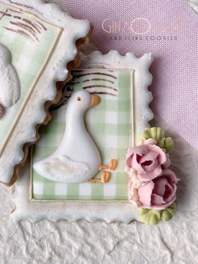 Per l’idea dei francobolli mi sono ispirata ai cutters di Lolano Cookie Cutters, creando l’effetto frastagliato interamente a mano, partendo da un banalissimo rettangolo. Per la decorazione, invece, ho fatto di testa mia…..