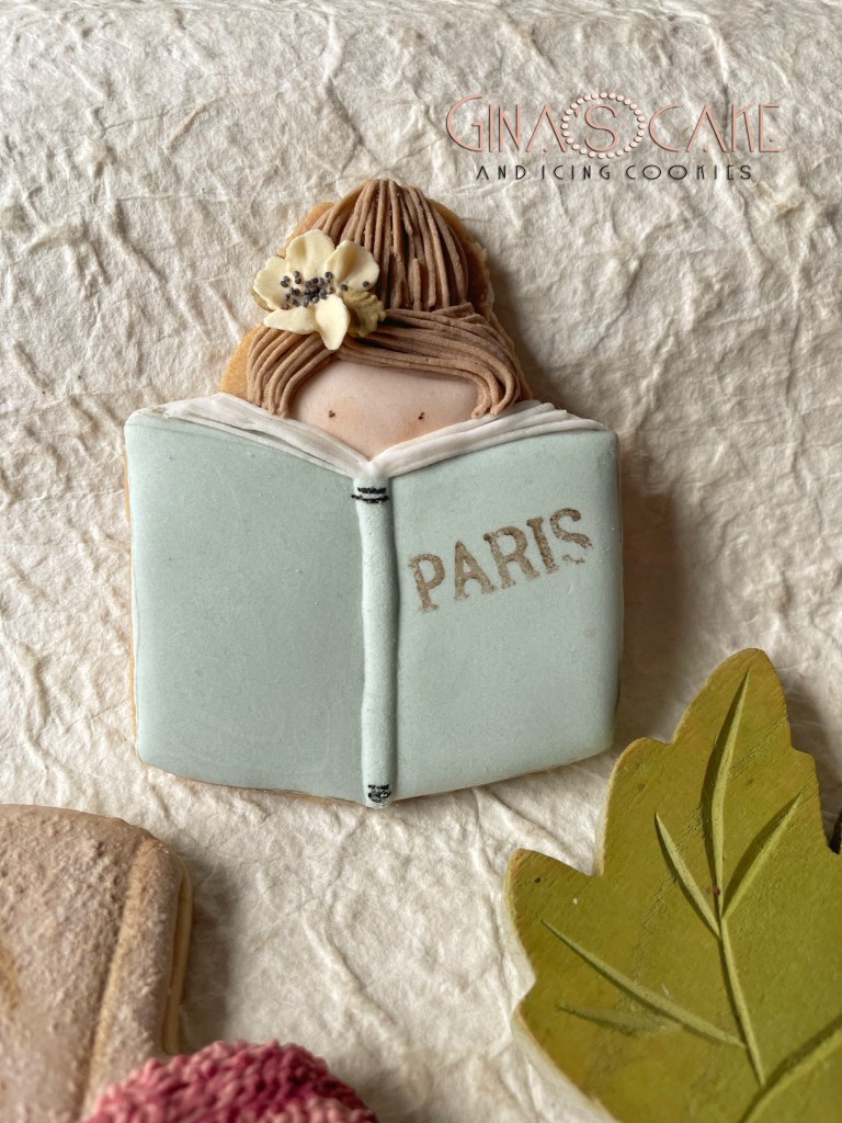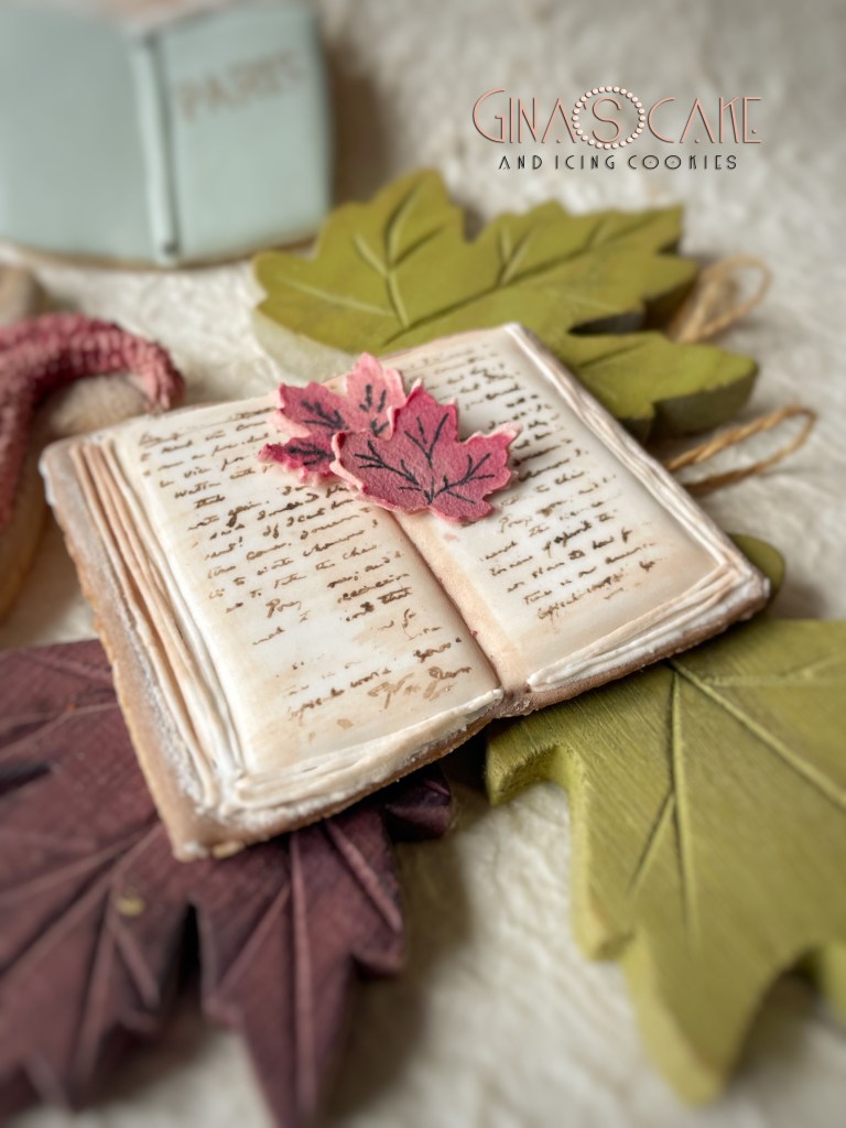 Le scritte del libro sono state realizzate con un timbro tamponato con il colorante alimentare in gel, invece per le foglie ho utilizzato uno stencil spatolato con della ghiaccia reale rosa antico, dalla consistenza stiff. Dopo la completa asciugatura, le ho dipinte con colorante in polvere diluito con alcol e ho realizzato le venature con pennarello alimentare a punta fine.
