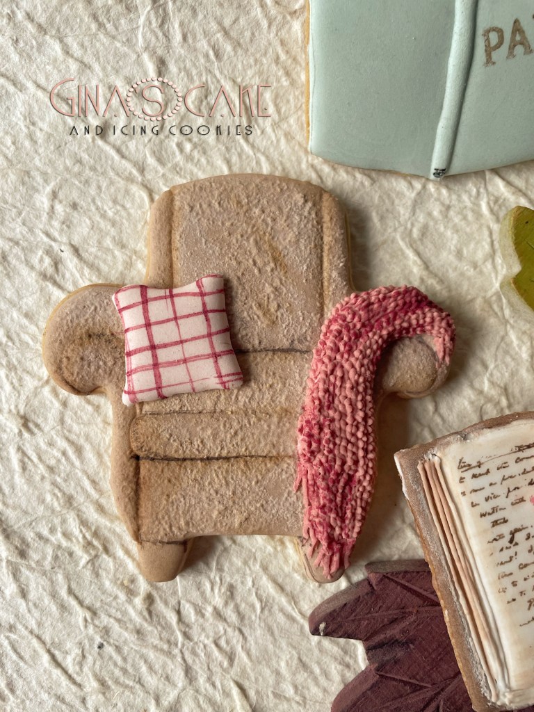 Vi racconto alcuni dettagli tecnici specifici per questi biscotti. Nella poltrona ho cercato di rendere un effetto 3D usando la prospettiva e applicando cuscino e coperta con la tecnica del transfert, quindi entrambi sono stati realizzati a parte e poi inseriti solamente dopo completa asciugatura. Il risultato non mi soddisfa pienamente: ai miei occhi, questa poltrona è ancora troppo “piatta”. Sulla poltrona compare anche l’ormai noto Effetto Pelliccia, per il quale sono finalmente riuscita a realizzare un reel già postato alcuni mesi fa su Instagram. Per i pigri, eccolo qui.
