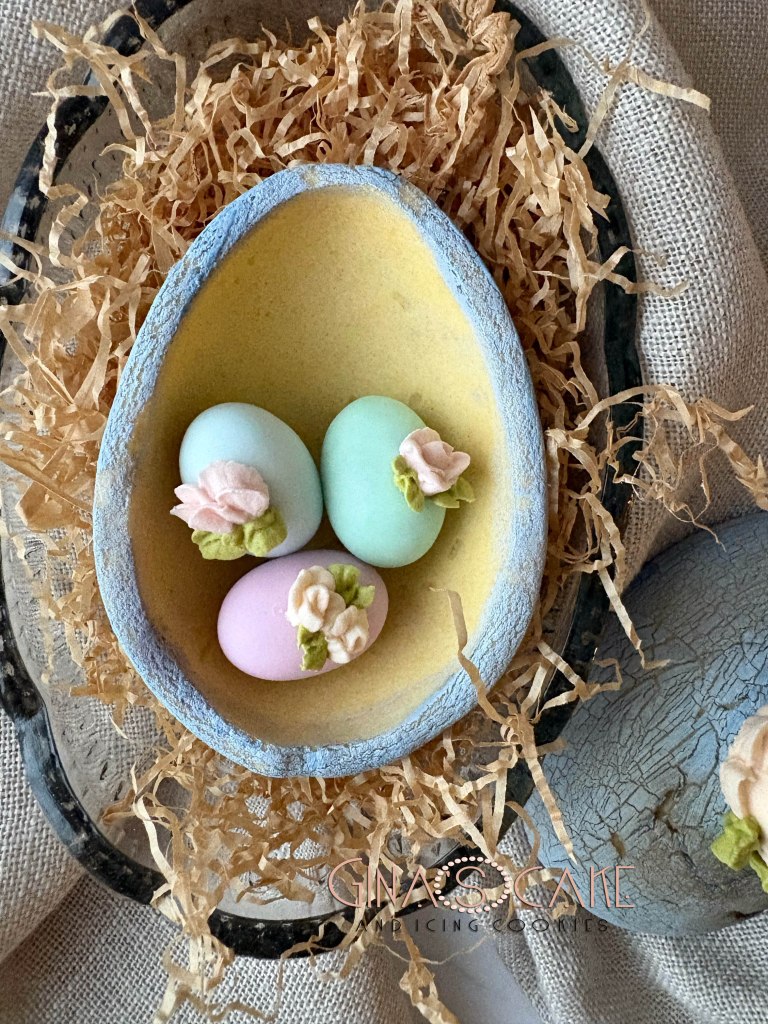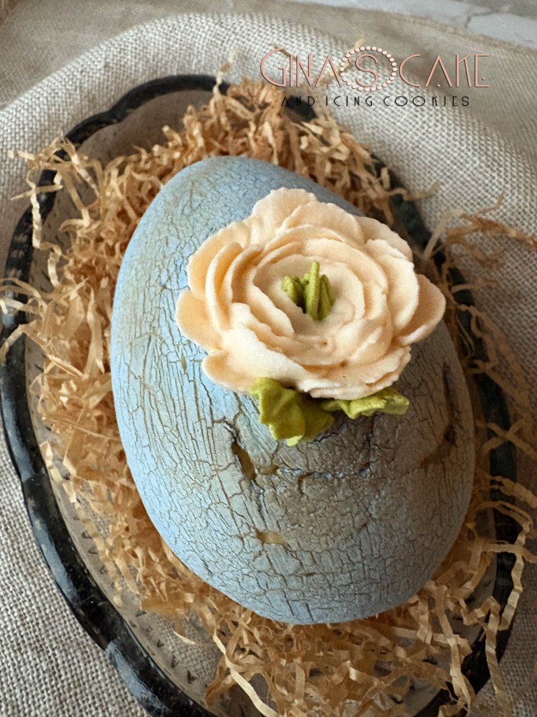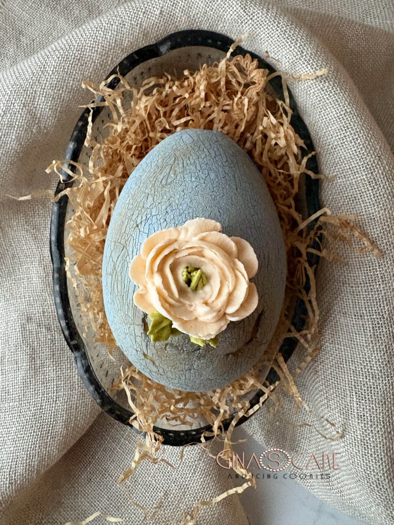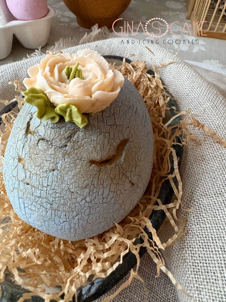 In questo uovo, invece, per la base ho utilizzato l’effetto craquelè, evidenziando ulteriormente le crepe naturali della frolla per rendere maggiormente l’effetto invecchiato. Gli ovetti sorpresa sono anch’essi decorati con fiorellini in giaccia reale. Se volete vedere come li ho fatti, questo è il link del reel da consultare (clicca qui)