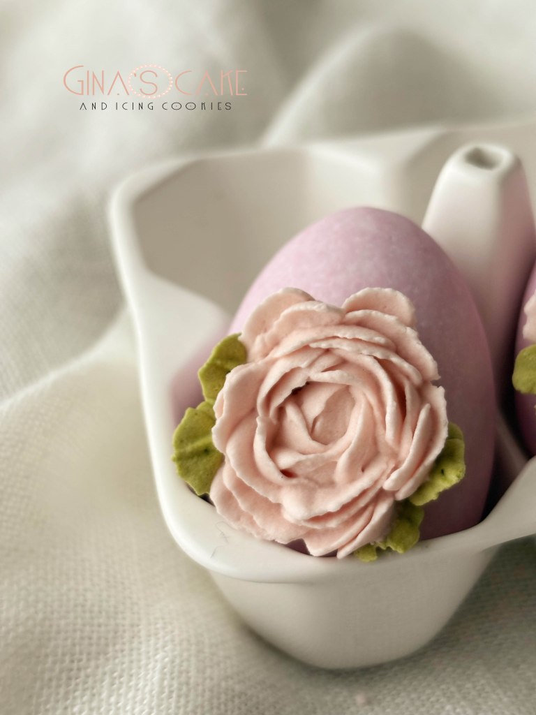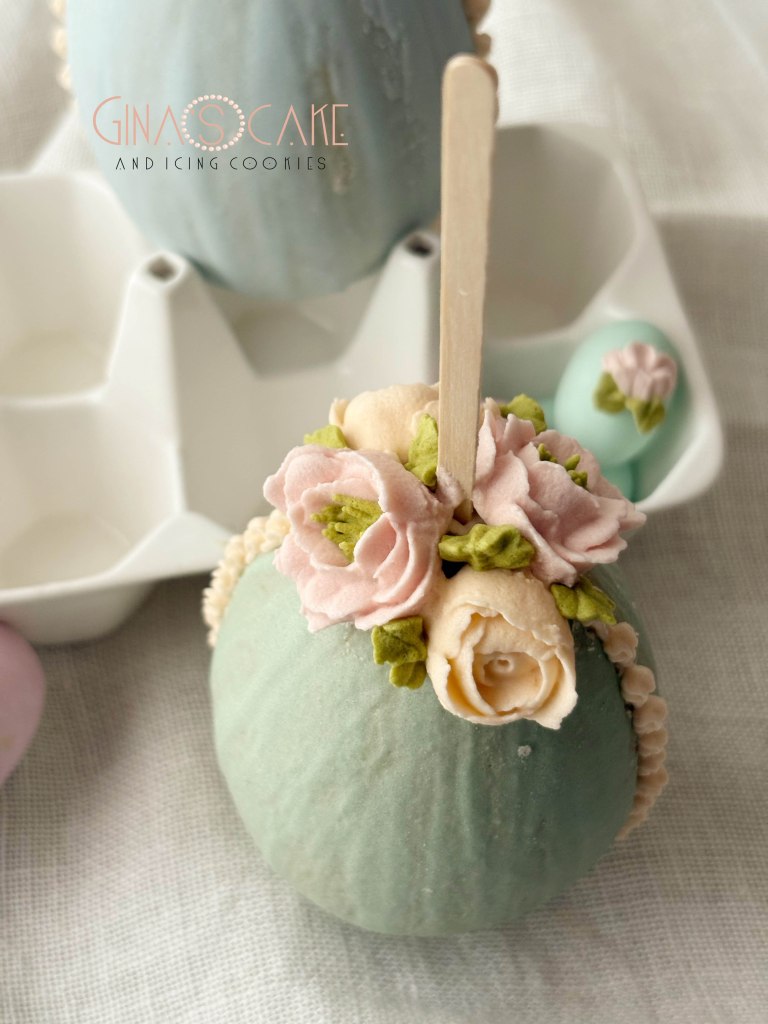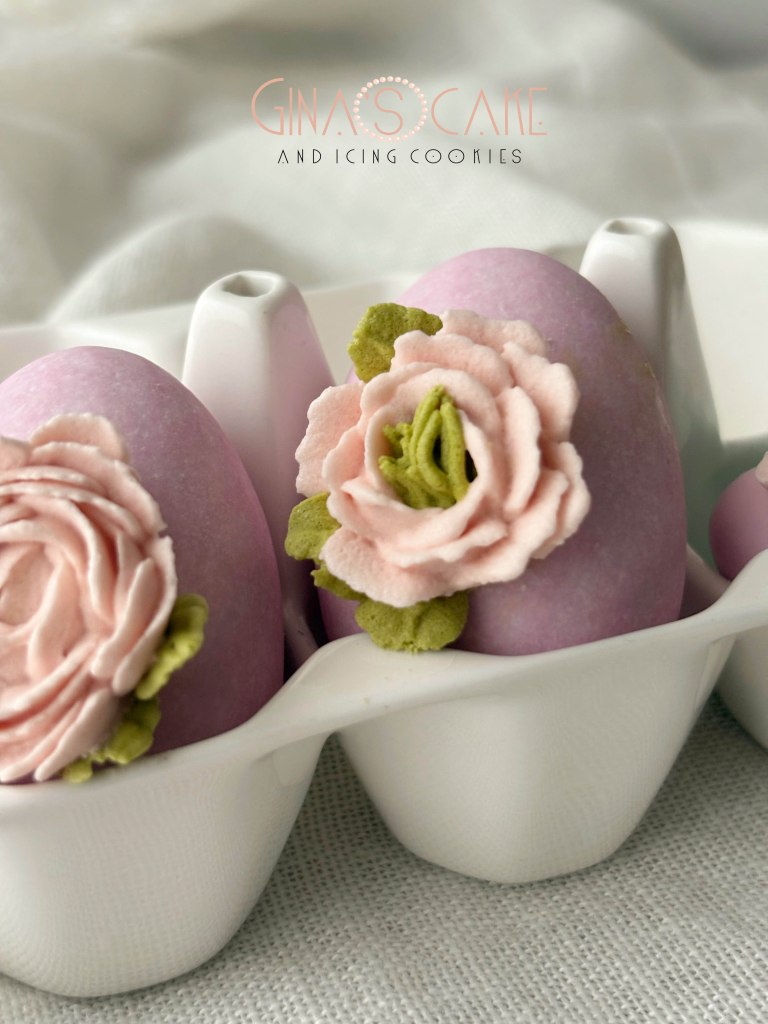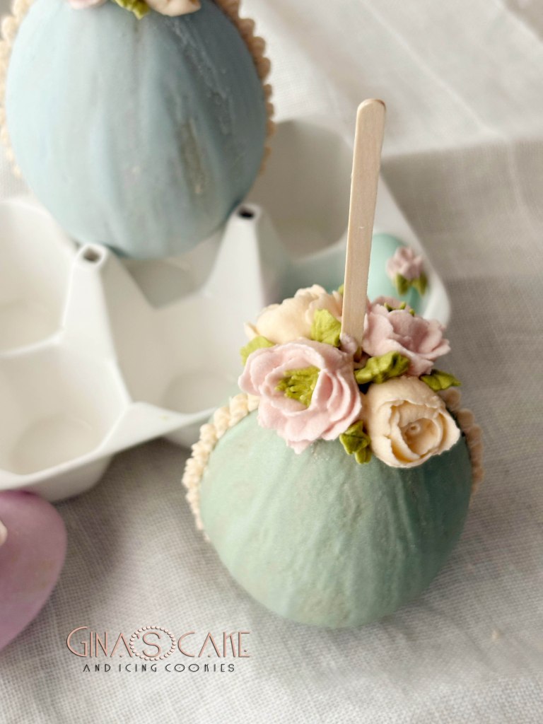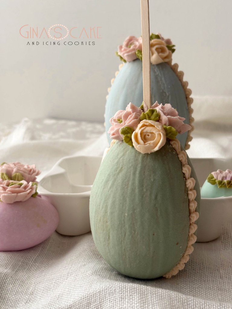 Queste sono le uova che ho decorato io, prendendo spunto semplicemente dal mio stile! Le uova sono alte circa 10 cm e possono contenere delle piccole sorprese. Non mi soffermo sulla cottura dei gusci perchè appunto c’è già chi l’ha fatto ampiamente; in quanto alla decorazione, ho utilizzato la ghiaccia reale fluida per rivestire la base e poi ho inserito i miei amatissimi fiori. Tra un guscio e l’altro ho inserito un piccolo stecco con lo scopo di fare in modo che le uova stessero in piedi e non coricate.